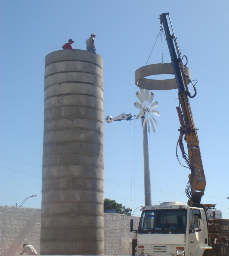Nossa estrutura é composta por 03 peças. Uma base, um tubo de concreto armado e um suporte para caixa d’agua, onde suporta um volume de 5 a 10 m3, elevando a um pé direito de 5,5 mts de altura.