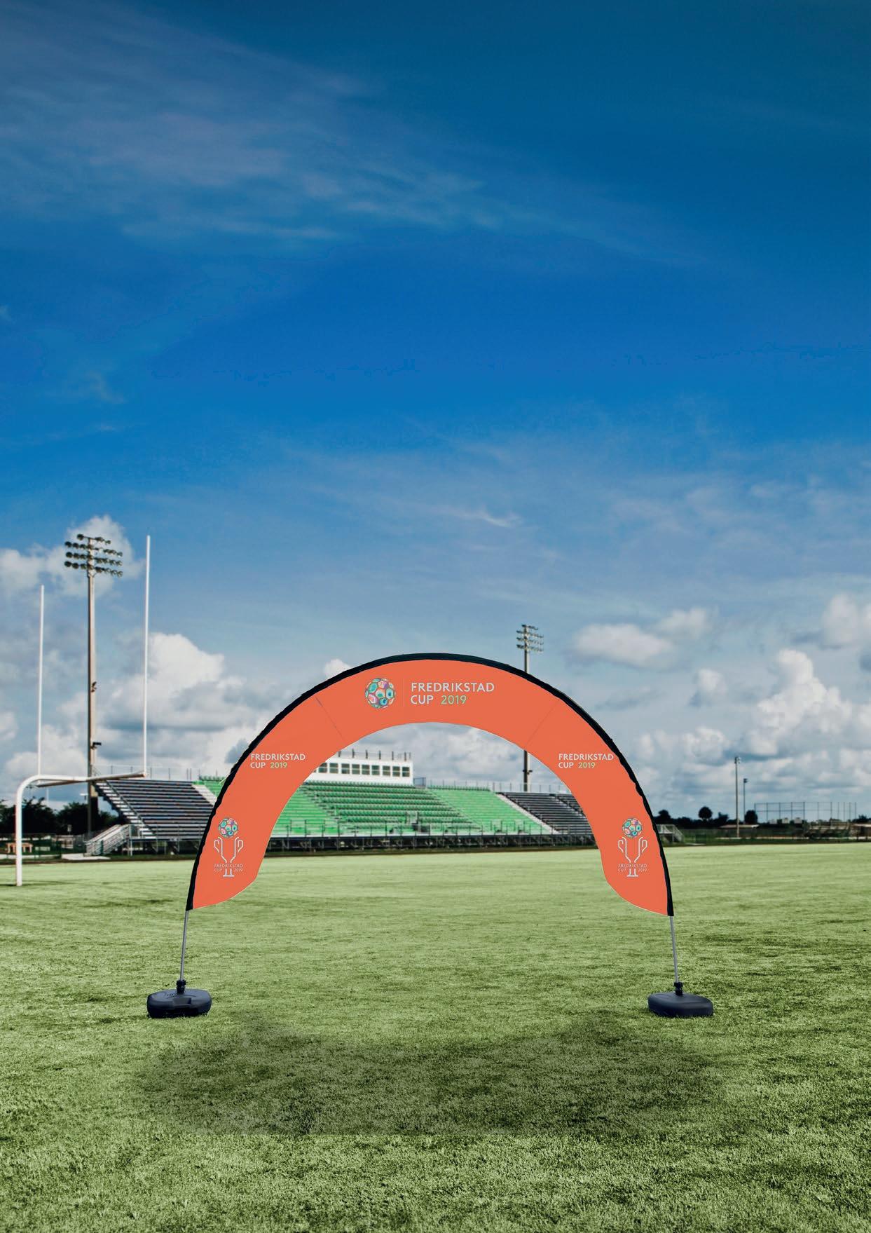 Portal/målbue med glassfiberstenger gjør den lett å transportere og montere uten bruk av elektrisk luftpumpe. Trykk i CMYK på en side med gjennomsyn.Leveres i to størrelser: 5.5*3 meter og 3.6*2.4 meter. Like egnet til utendørs som innendørs arrangement.Leveres med bærebag for stengene. Fot kommer i tilegg, velg mellom kryssfot, jordspyd eller vanntank.