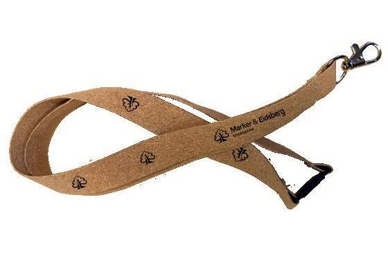 Lanyard i korkmateriale. 20 mm bredde. Trykk i en farge inkludert. Leveringstid: 3-4 uker.