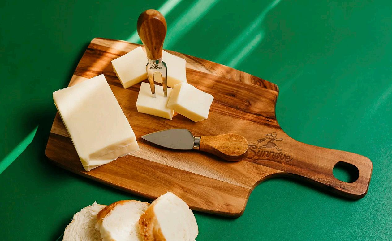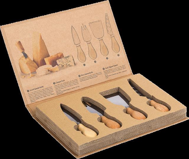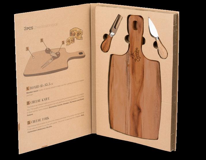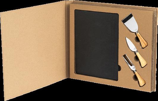 Settet inneholder skjærefjøl ostekniv, og ostegaffel i gaveinnpakking.