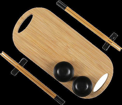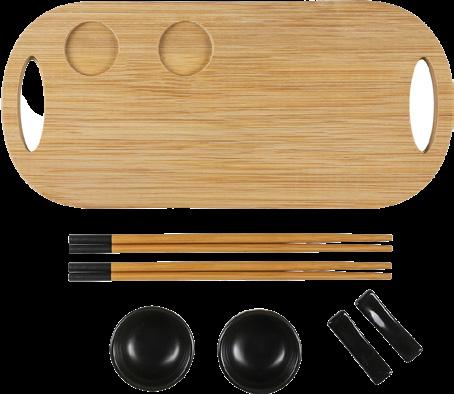 Settet inneholder 2 bambusspisepinner, 2 soyasausskåler, 2 spisepinneholdere og en bambusserveringsplate på 33 x 15 x 1,5 cm.