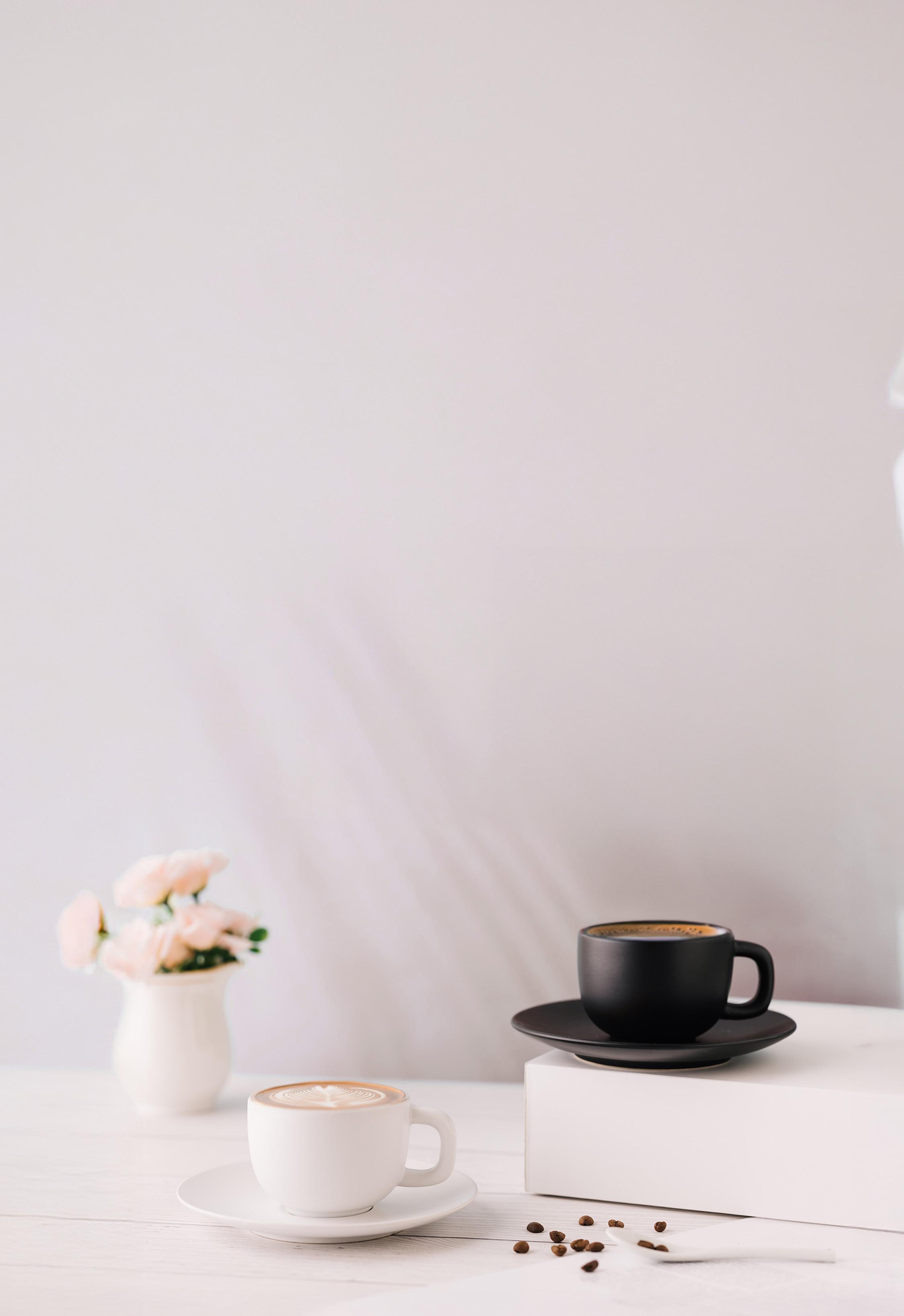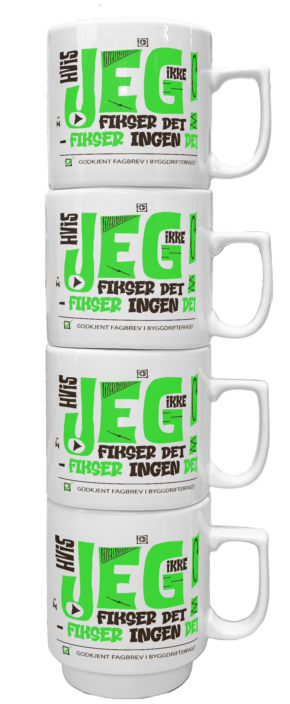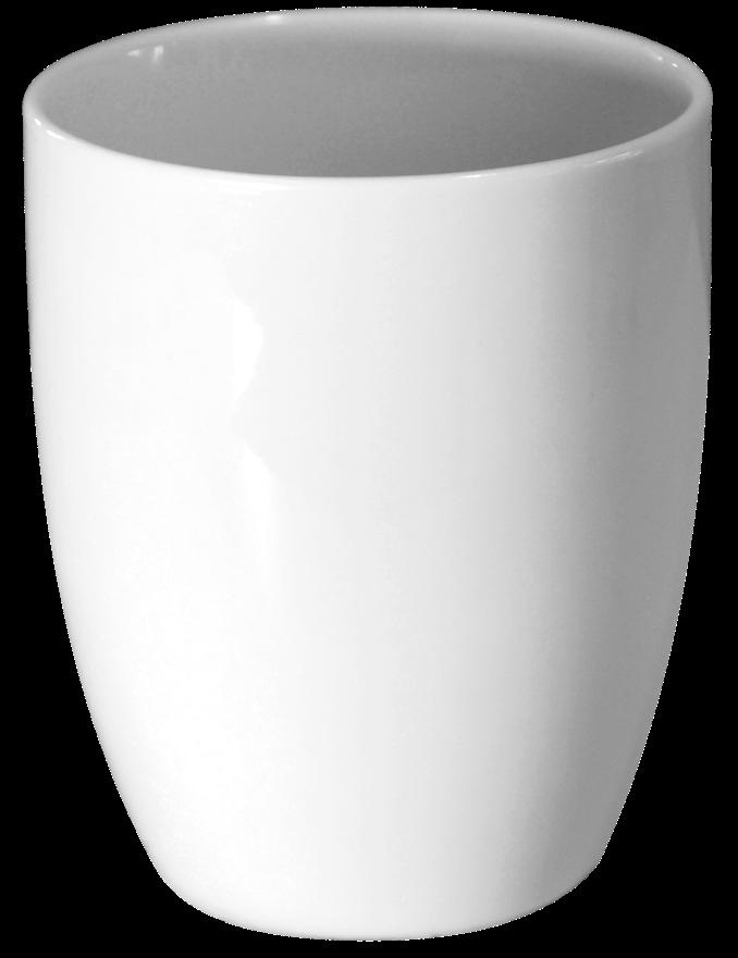 Porselenskrus med blank hvit glasur. Disse krusene kan stables på hverandre i skapet.