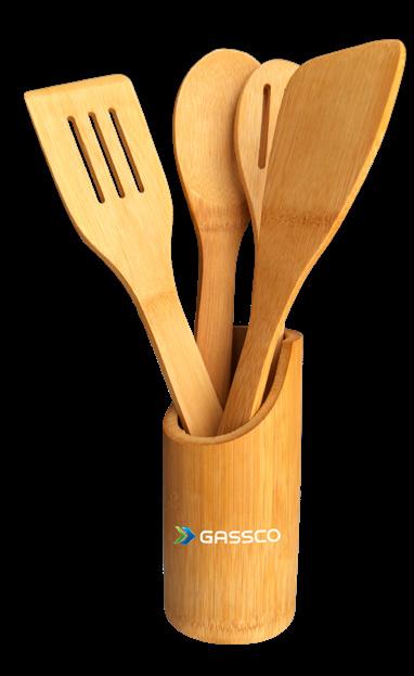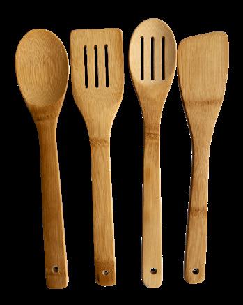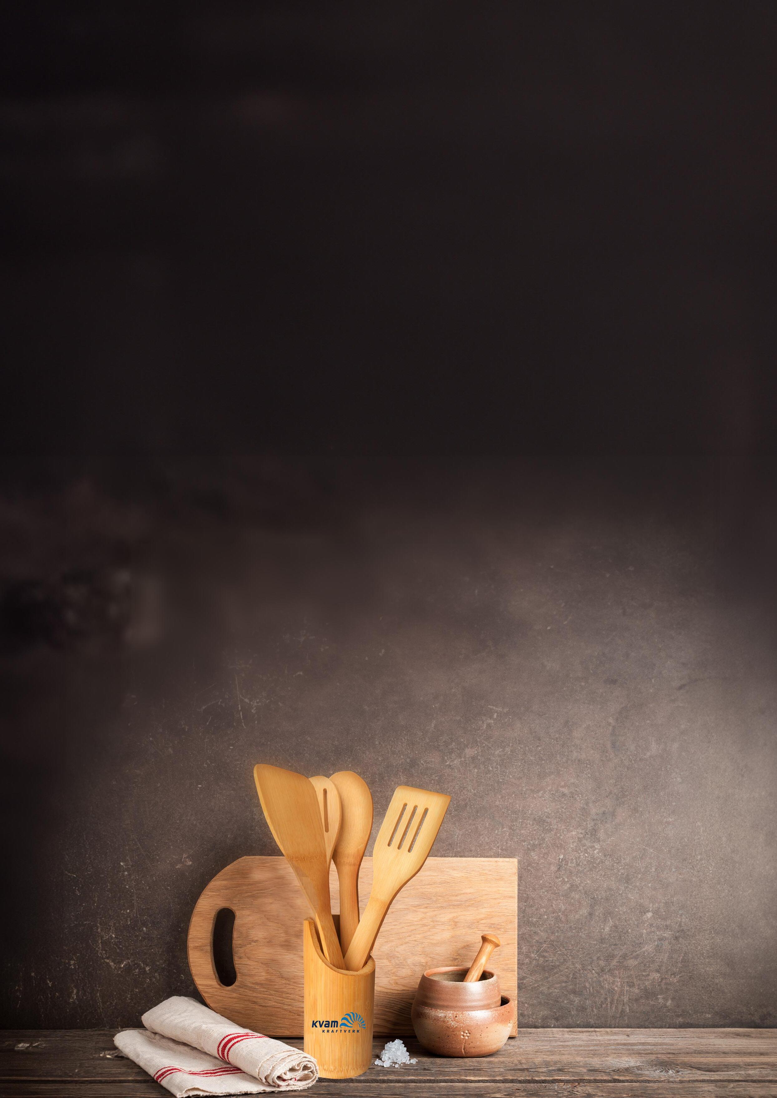 Miljøvennlige kjøkkensett i bambus, en komplett samling av nødvendige redskaper for ethvert moderne kjøkken. Dette settet inkluderer en stekespade både med og uten riller, samt skjeer som kan brukes til å røre eller servere salater, også disse med og uten riller. Bambus er et utmerket alternativ til plast da det er sterkt, slitesterkt og biologisk nedbrytbart.