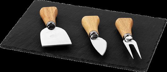 Elegant serveringsfat i skifer med tilhørende ostesett, perfekt for stilfull servering av ost, tapas og delikatesser. Settet inkluderer fire deler, der knivene har ergonomiske trehåndtak for et behagelig grep.
