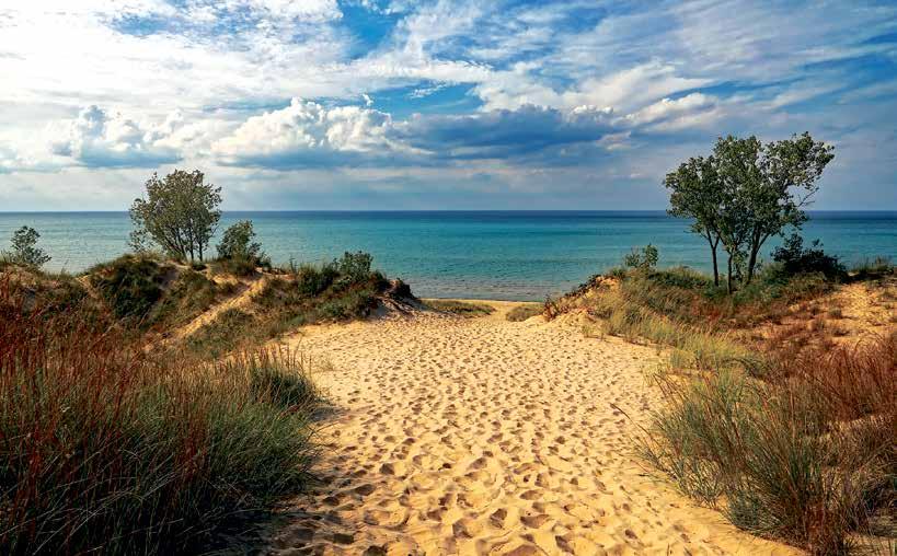 Indiana Dunes National Park, an allseason playground, consists of shifting sand dunes, tranquil woodlands, prairies and verdant wetlands. The riverbanks of the Heron Rookery—a birder’s paradise— are speckled with wildflowers in the spring. Summer is the ideal time to build sandcastles, admire Lake Michigan sunsets and go swimming or hiking. The Calumet and Dunes Kankakee Bike Trails are known for their views in late summer and early fall. As the trees burst with fall