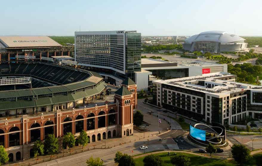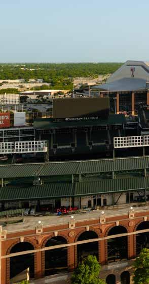 Located in Arlington’s Entertainment District, Globe Life Field is a stateof-the-art venue and home to Major League Baseball’s Texas Rangers. The 5.5-acre retractable roof, the largest mechanized roof in North America, ensures a comfortable experience yearround for baseball games, concerts, and special events. Just across the street, Choctaw Stadium, the Rangers’ former home, now hosts a variety of sporting events and gatherings.