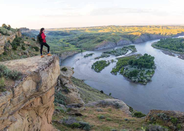 With cliffs that drop 200-500 feet to the river, this area features spectacular views of the Yellowstone River and surrounding plains that are bordered by mountains on the horizon. One side showcases an undeveloped natural area while the other highlights an industrial cityscape. The crown jewel of the area is Pictograph Cave State Park.