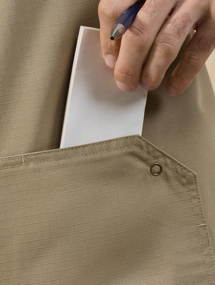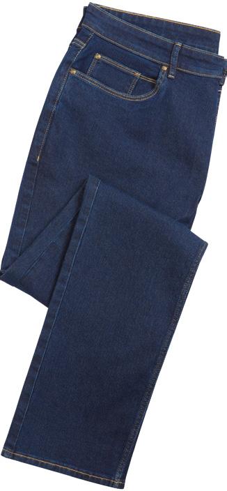 Five jean-style pockets with rivets and bar tacking for fabric reinforcement.