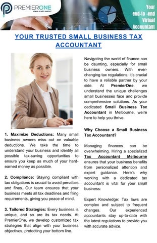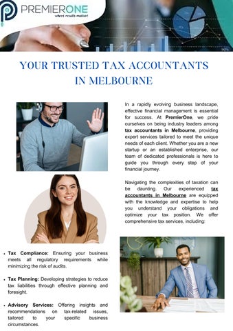 And for businesses in need of detailed tax strategies, our Tax Accountant Melbourne team is here to help you achieve peace of mind. With our dedicated services tailored to your specific needs, you can focus more on growing your business and less on navigating the intricacies of financial management. Let PremierOne guide you on your journey to financial health and success Contact us today to learn how we can transform your financial operations.