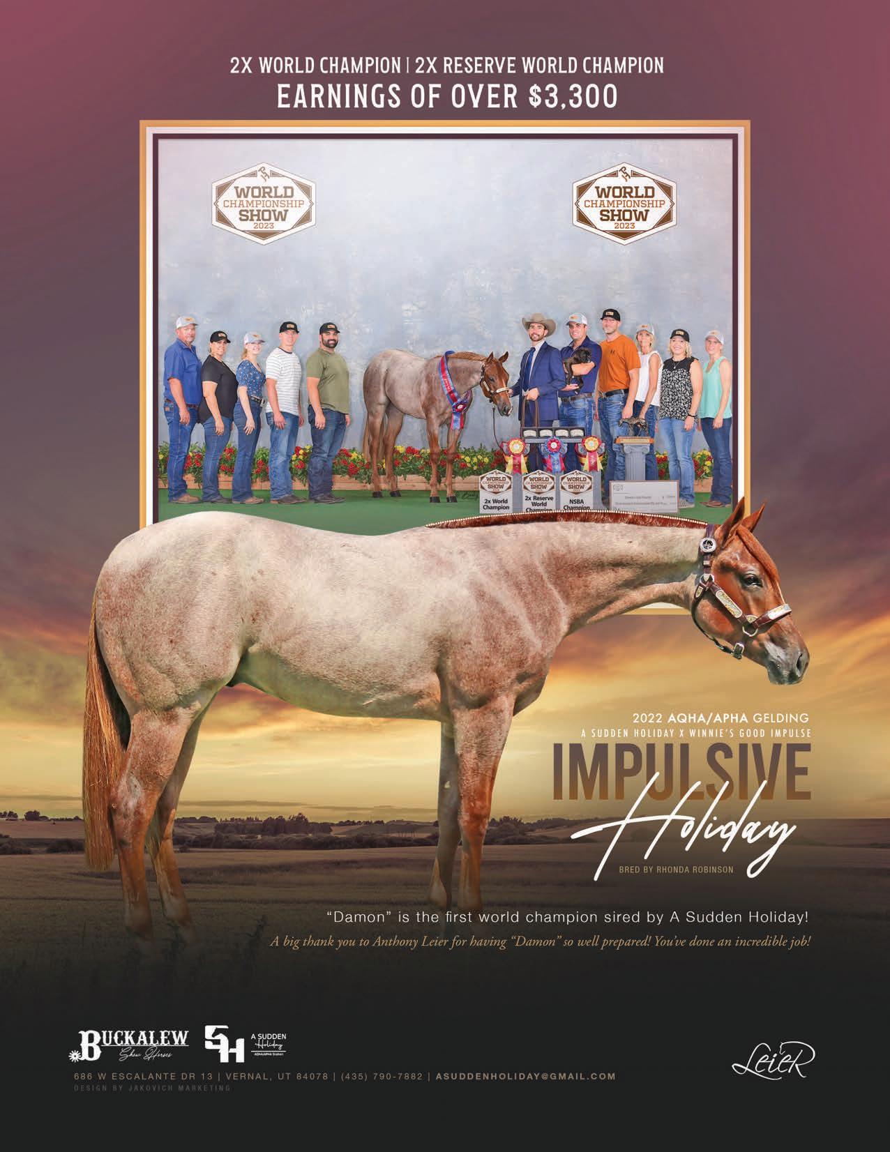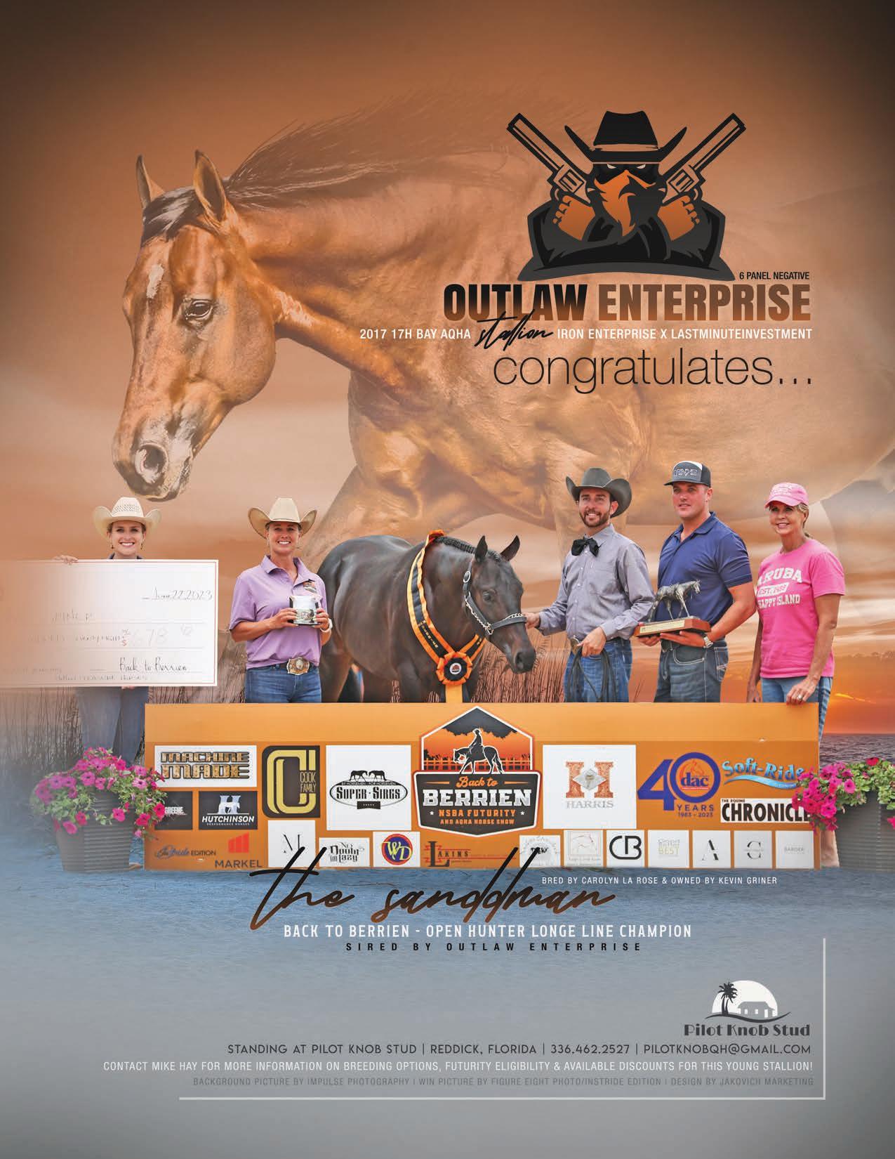 Degrees Outreach Education Sales Stallions Production Now accepting outside stallions to stand to the public Breeder and former home of Best Brew At The Bar Home to... The Krysum Kruzer Certain Potential Snip O One The program was developed to teach the equine student many aspects of the industry with hands-on practicality. The wide range of experience includes breeding, training, marketing, farm management, and health care.-------www.ufequine.com 352.376.0562PREMIER | AUGUST 2023 | 115