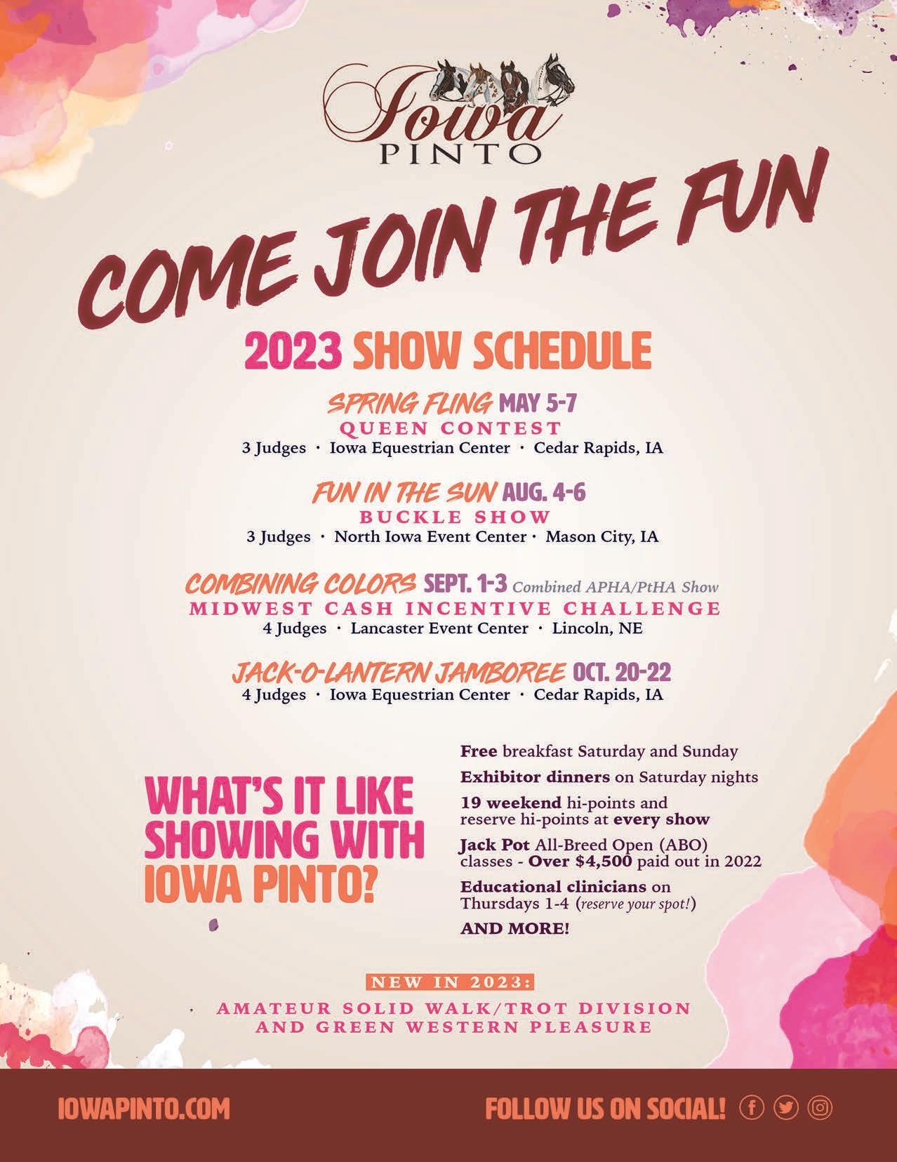 DESIGNATION OF HORSE EARLY FEE JULY 15 $300 LATE FEE AUGUST 25 $400 CLASS FEE $75 OFFSPRING DESIGNATION EARLY FEE JULY 15 $250 LATE FEE AUGUST 25 $350 $20,000+ TOTAL CASH + PRIZES GIVEN AWAY IN 2022. MIDWEST CASH INVENTIVE CHALLENGE VISIT IOWAPINTO.COM/?PAGE_ID=2363 FOR ELIGIBILITY AND QUALIFICATION INFORMATION.