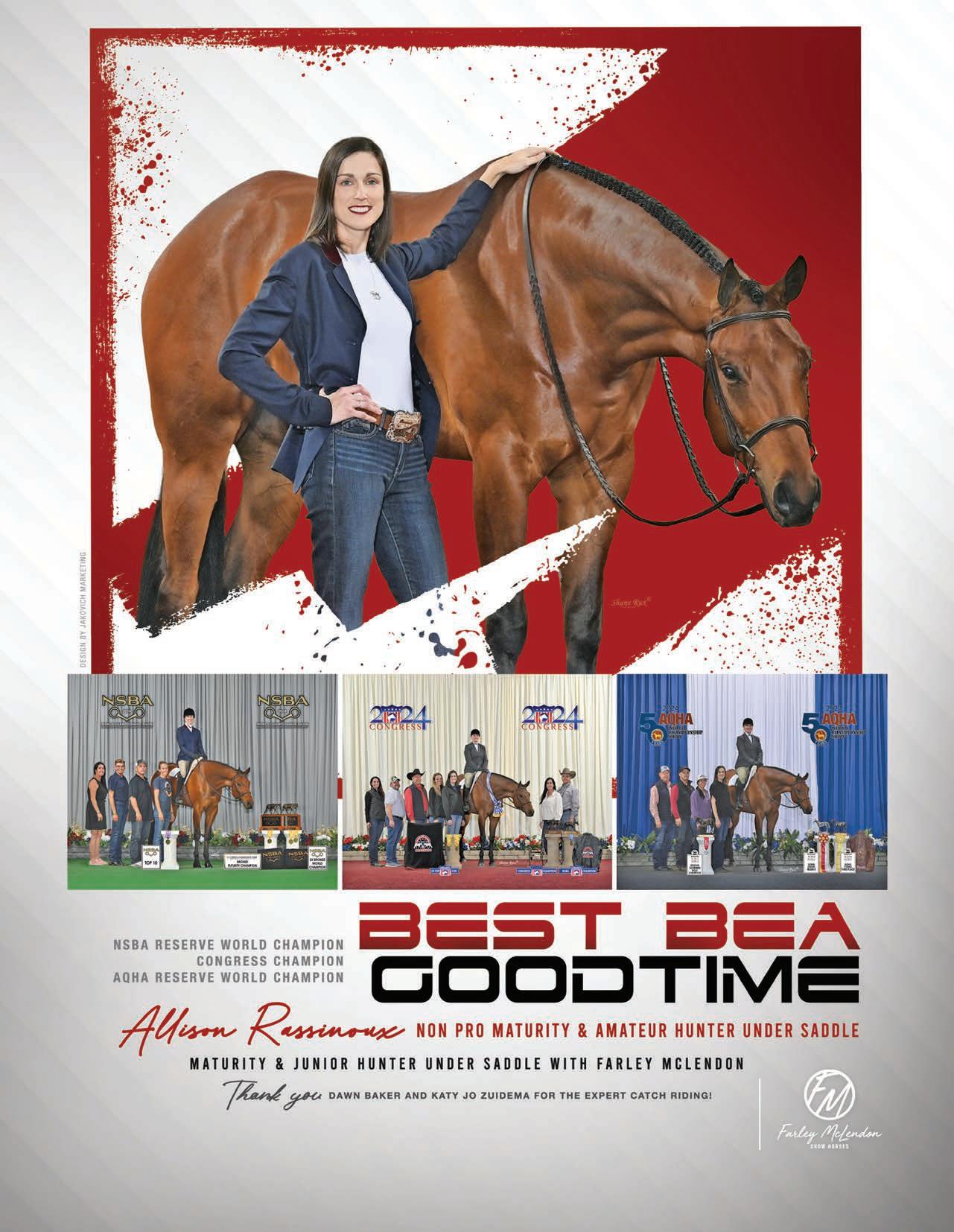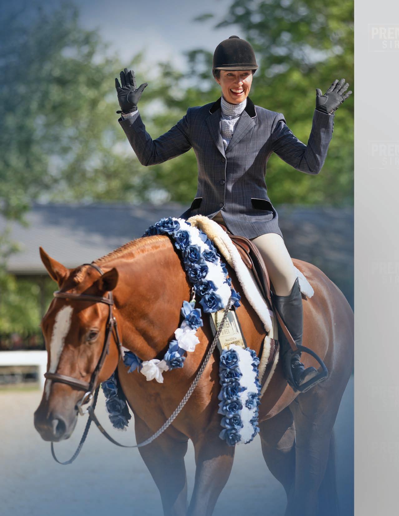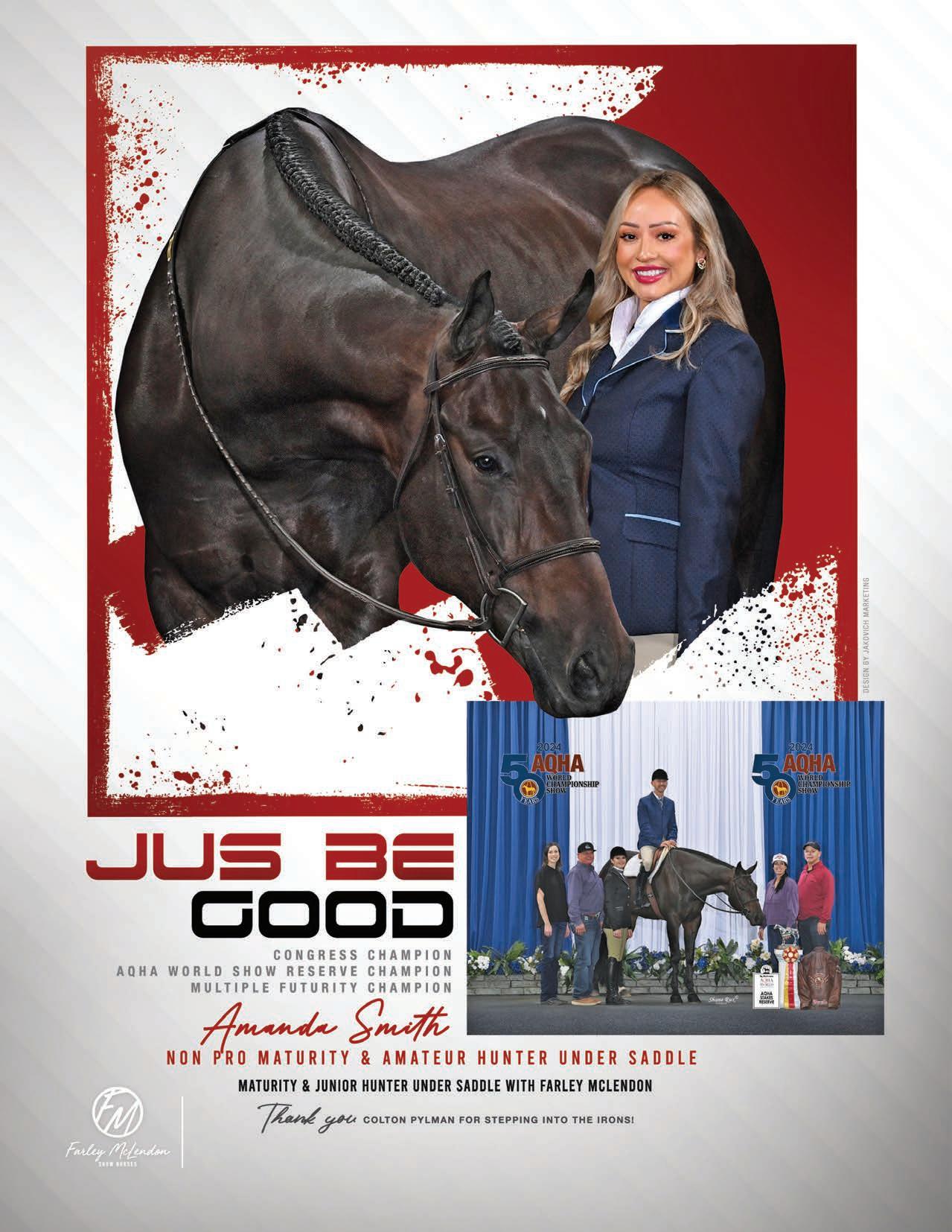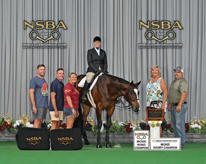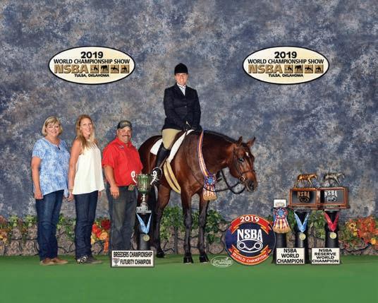 From there, the young horse took Danielson and the Zeitlers on a tremendous ride, winning NSBA World Championships in hunter under saddle in 2019 and 2020. As a two-yearold Outlaw and Judy Zeitler were NSBA World Champions in Two-Year-Old Limited Open Hunter Under Saddle and TwoYear-Old BCF Limited Open Hunter Under Saddle. The next year they won the Three-Year Old Open Hunter Under Saddle. Outlaw earned multiple futurity titles as a two and threeyear-old including unanimously winning the Three-Year-Old Open Hunter Under Saddle at the Tom Powers Futurity. In 2019, Outlaw won the AQHA World Championship in Junior Hunter Under Saddle.