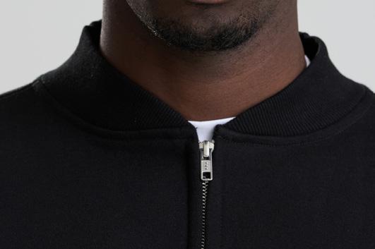 Details include a YKK silver zip, 2x1 ribbed collar, ribbed cuffs and hem, plus features like a locker patch for rebranding and a practical hanging loop. Completed with a size label only — the perfect base for branding.