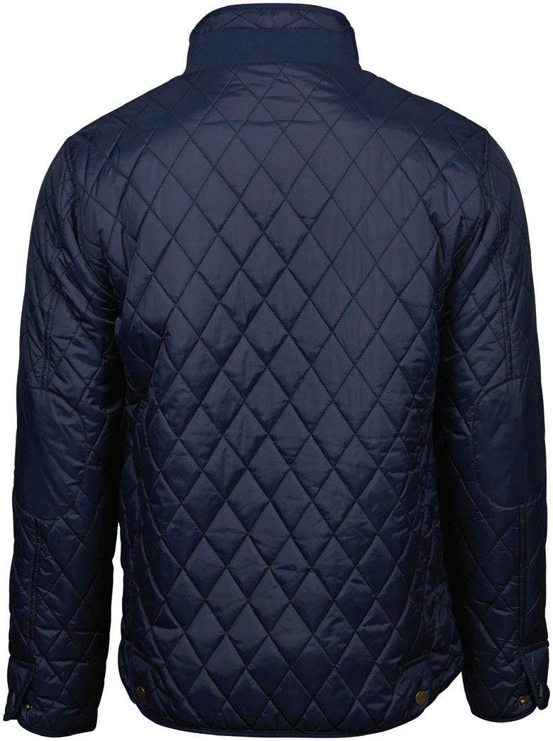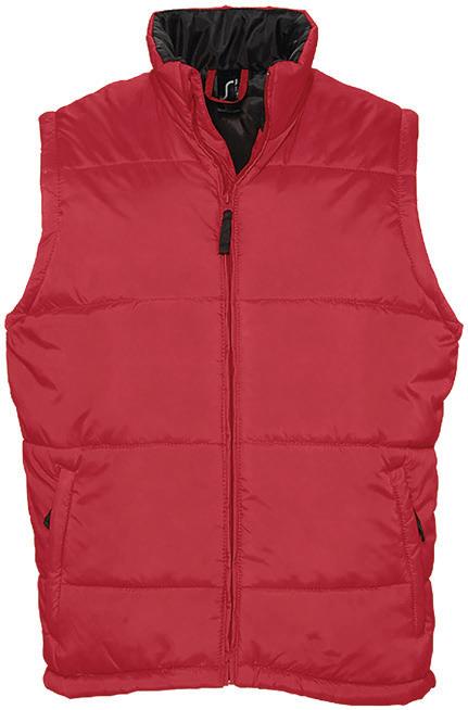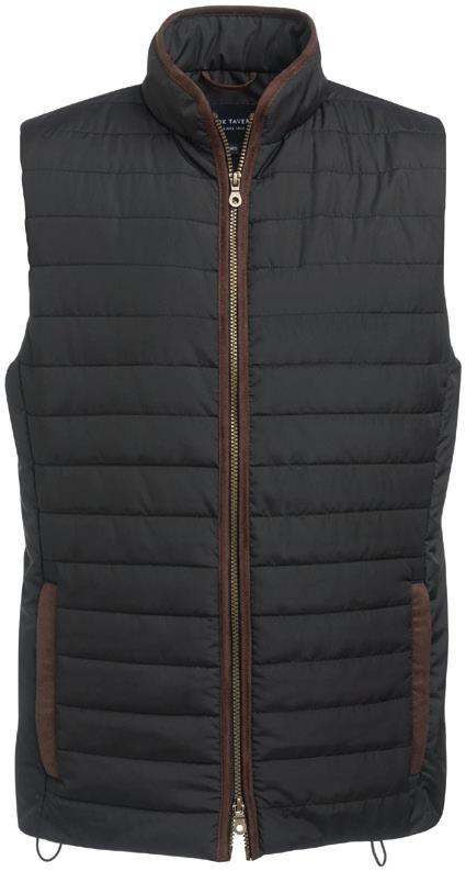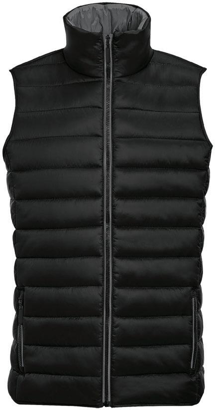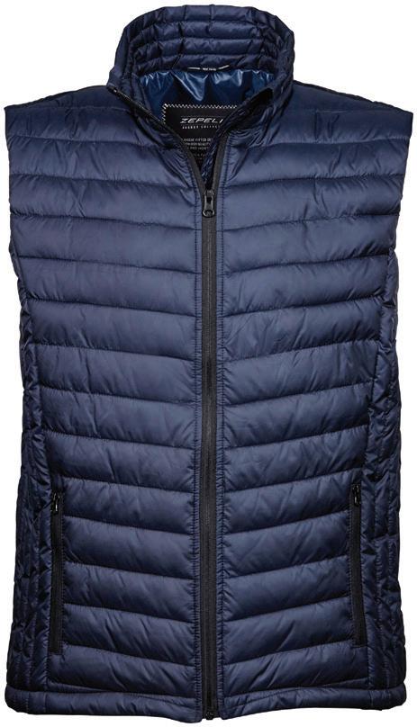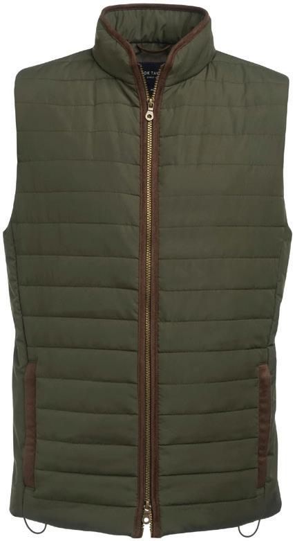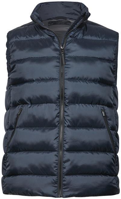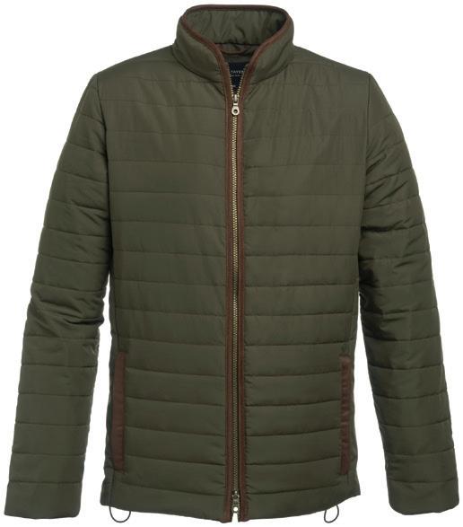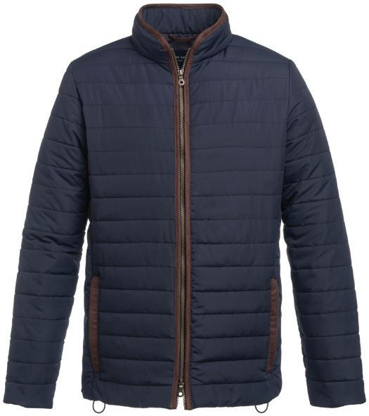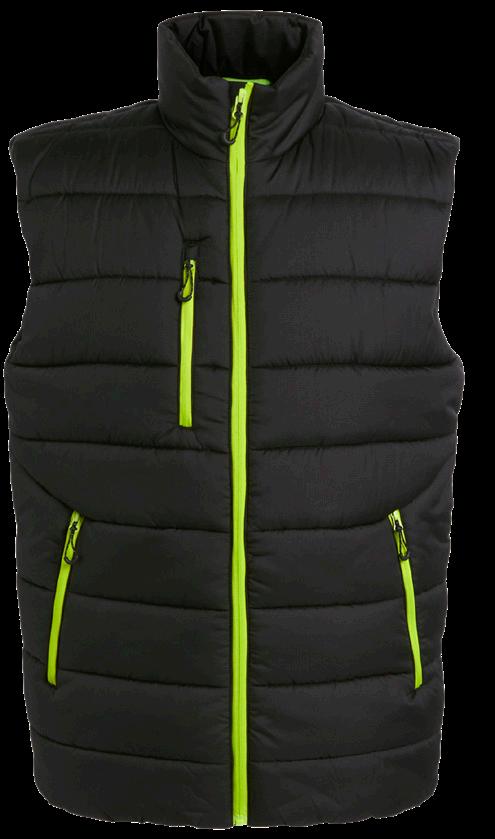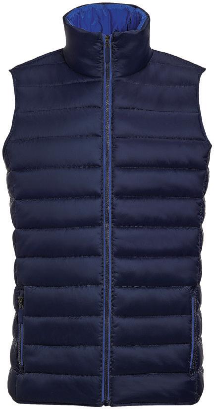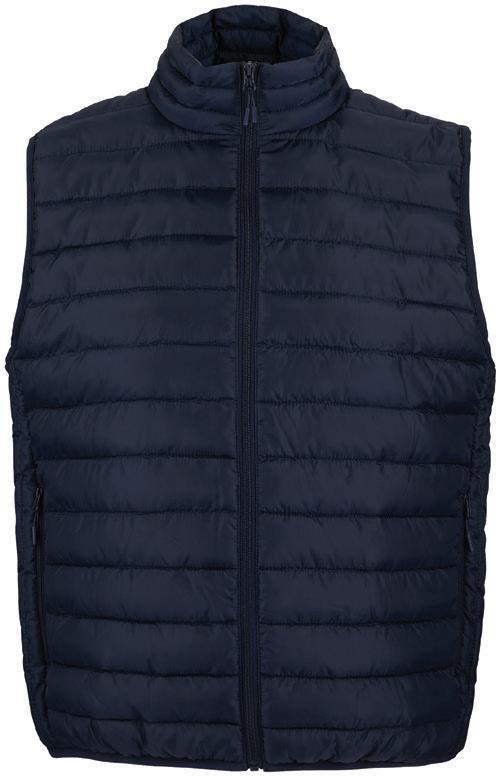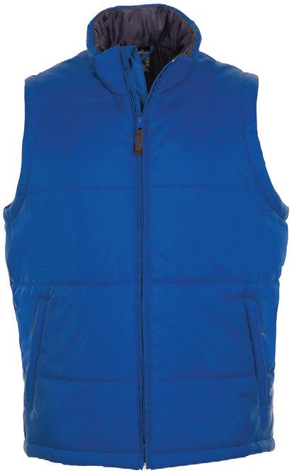 Polyester padding and lining. Showerproof and windproof. Contrast lining and trim. Elasticated bound armholes.