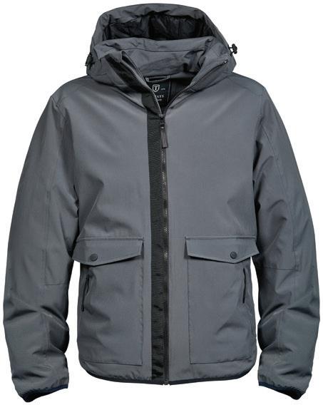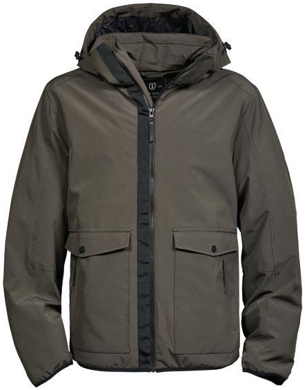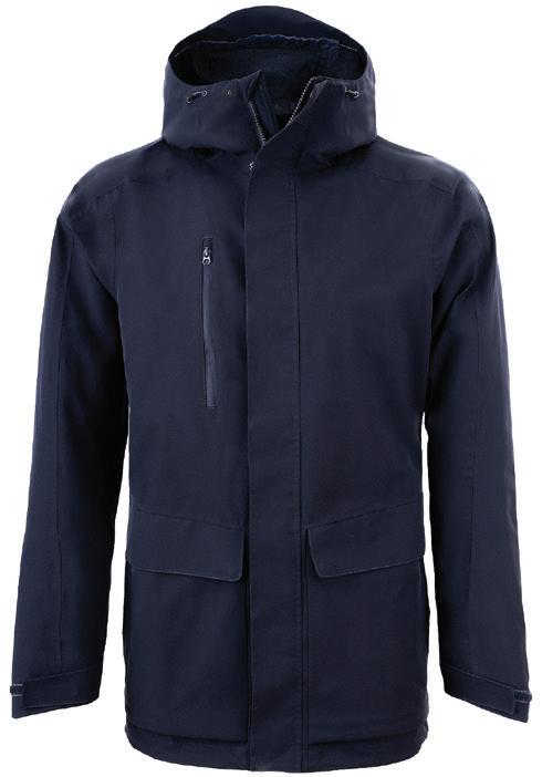 Hydrafort 5000 peached polyester outer. Polyester mesh lining. Waterproof with taped seams. Windproof. Concealed adjustable hood. Two front zip pockets and one inner pocket. Drawcord hem.