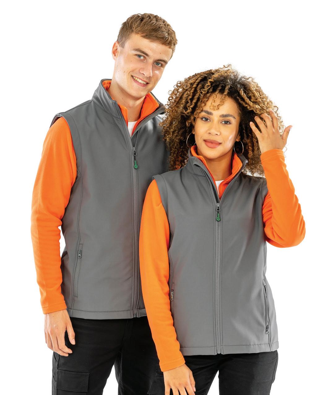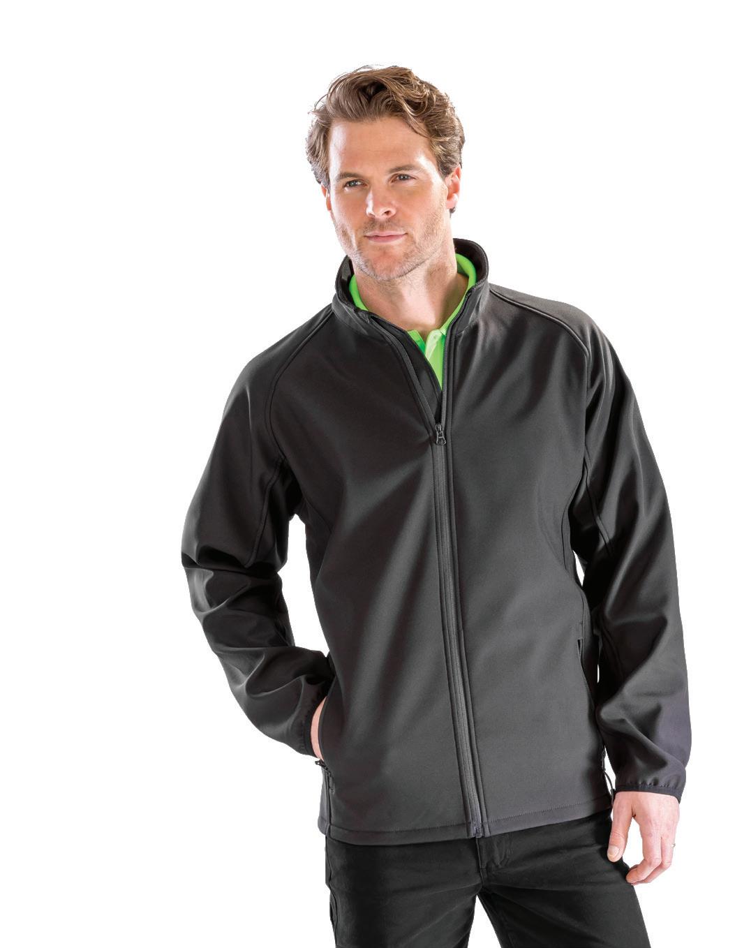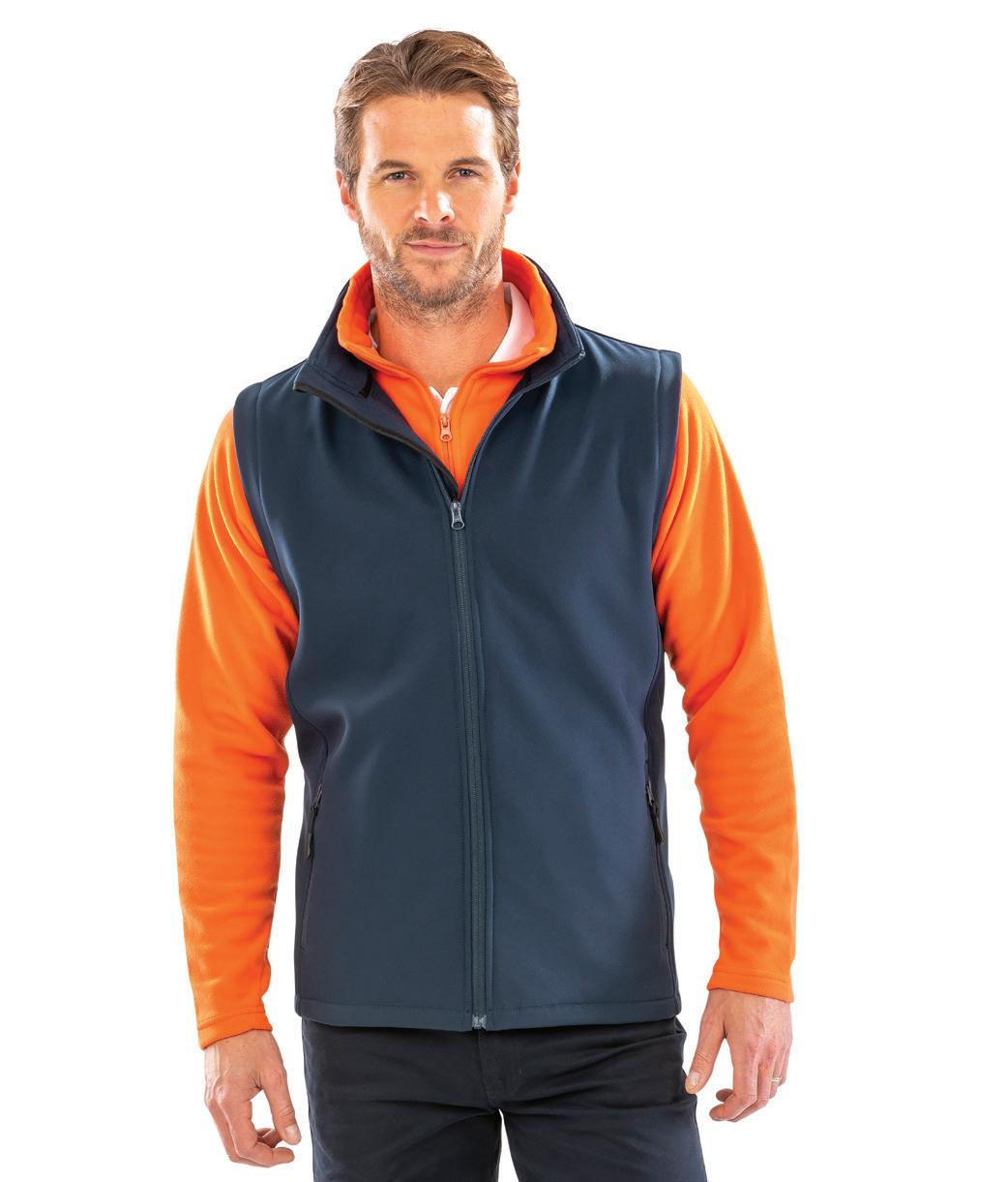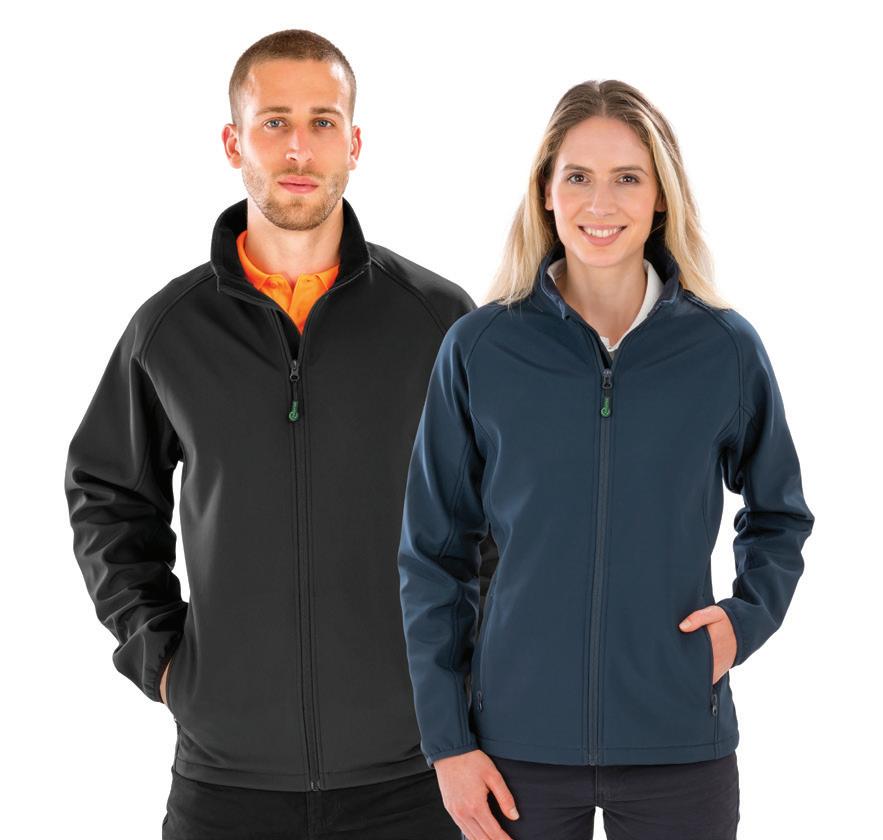 Warm backed polyester soft shell outer layer, made from at least 50% recycled polyester. Recycled fleece lining. Showerproof. Reflective detail on right sleeve, pockets and centre back hem. Open cuffs and hem. Available in Mens RG627 and Ladies RG628.