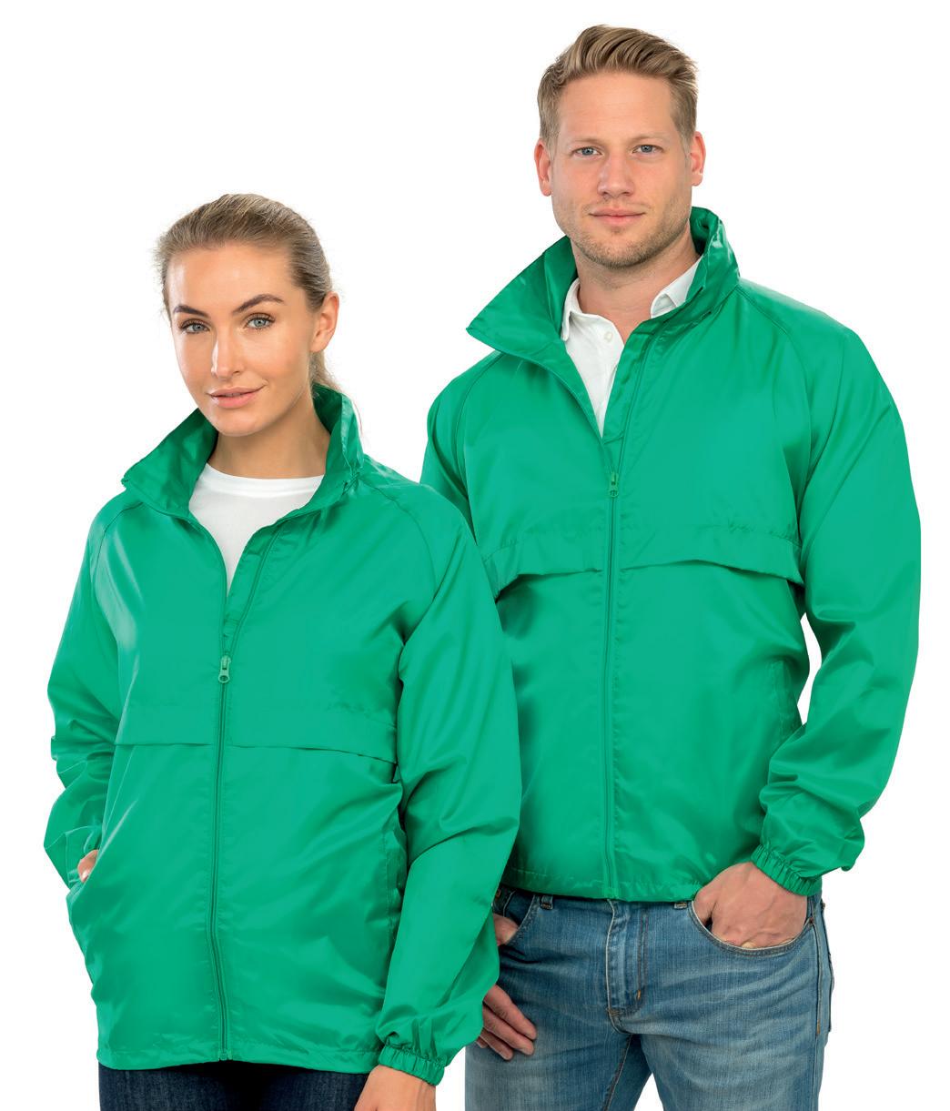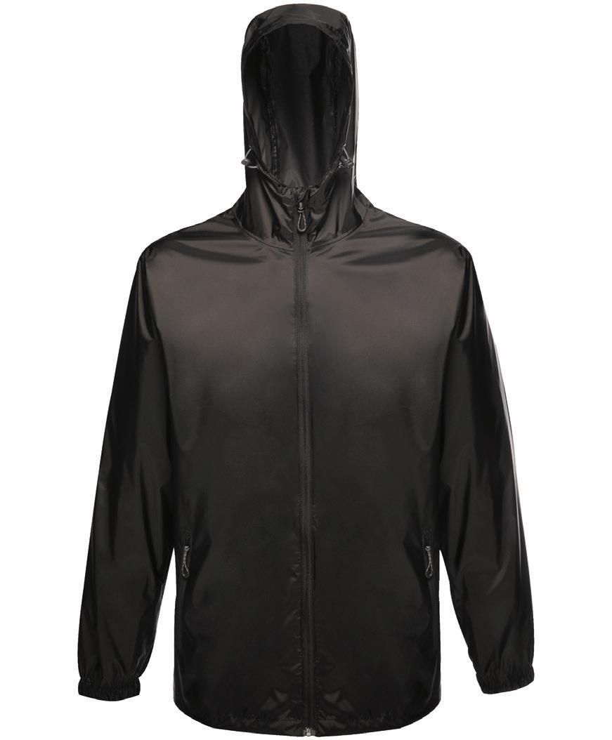 100% polyamide 210T nylon shell. Unlined. Shower resistant and windproof. Concealed hood. Underarm ventilation eyelets. Elasticated cuffs. Drawcord at hem. Packs/zips into front right pocket. Available in Adults 32000.