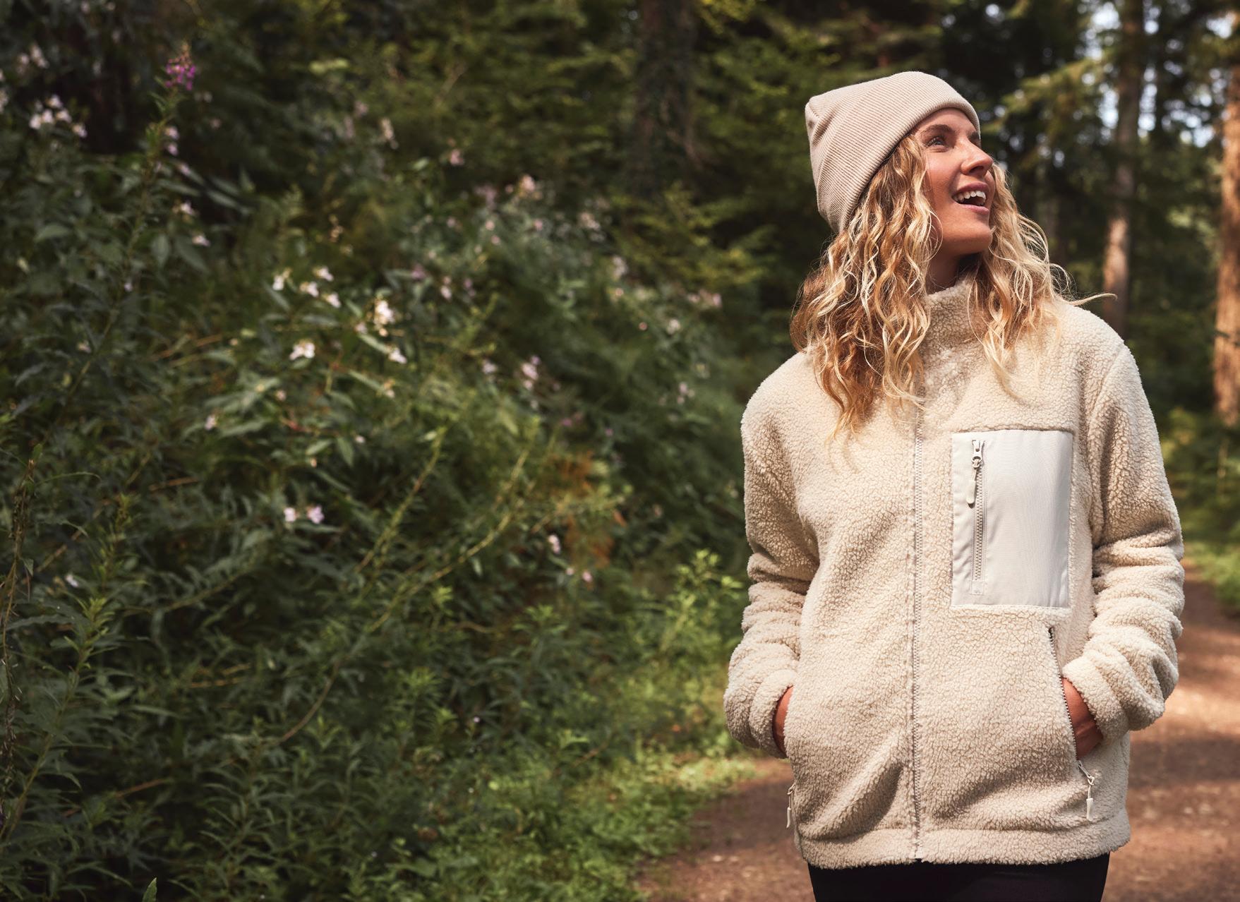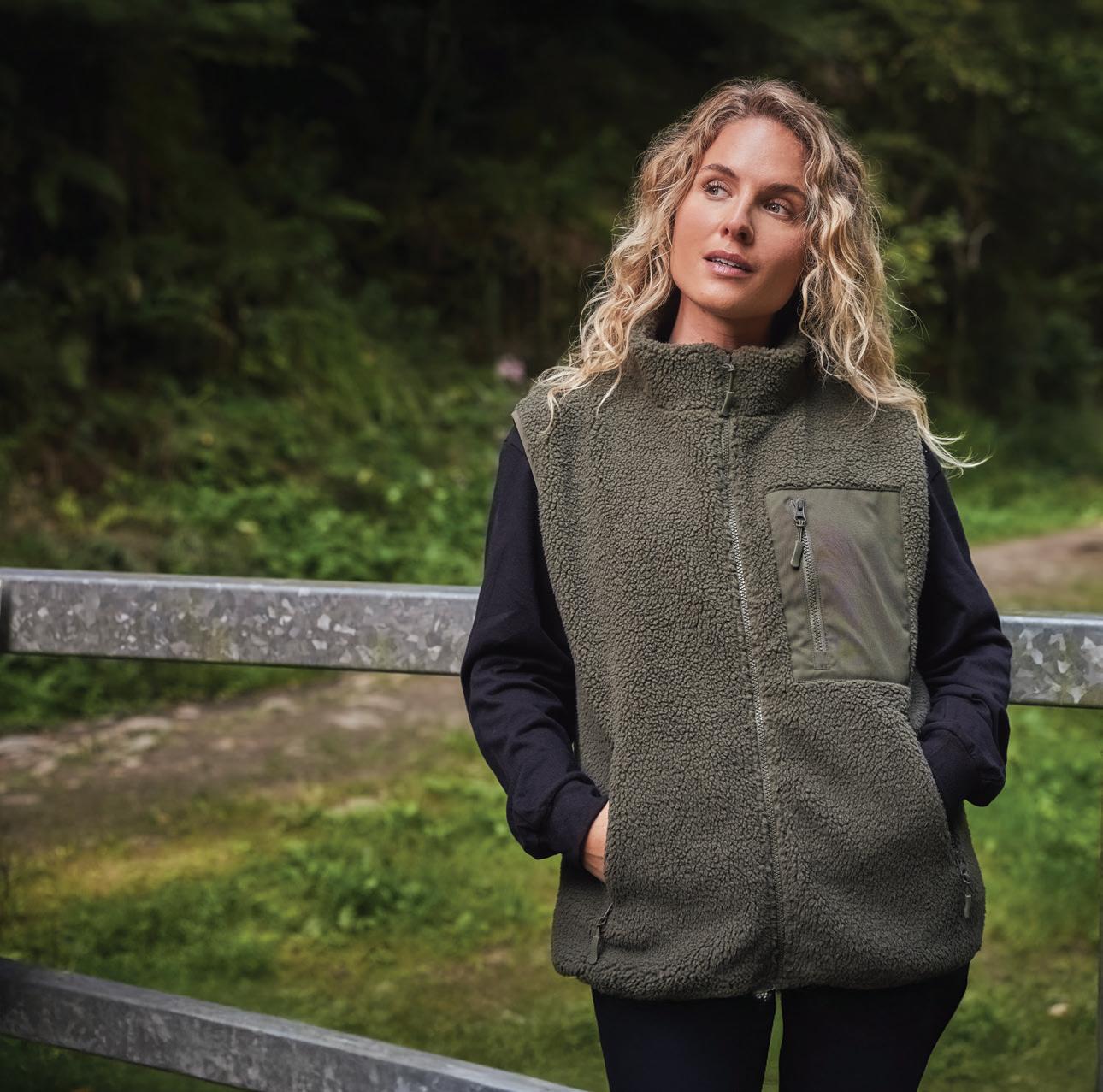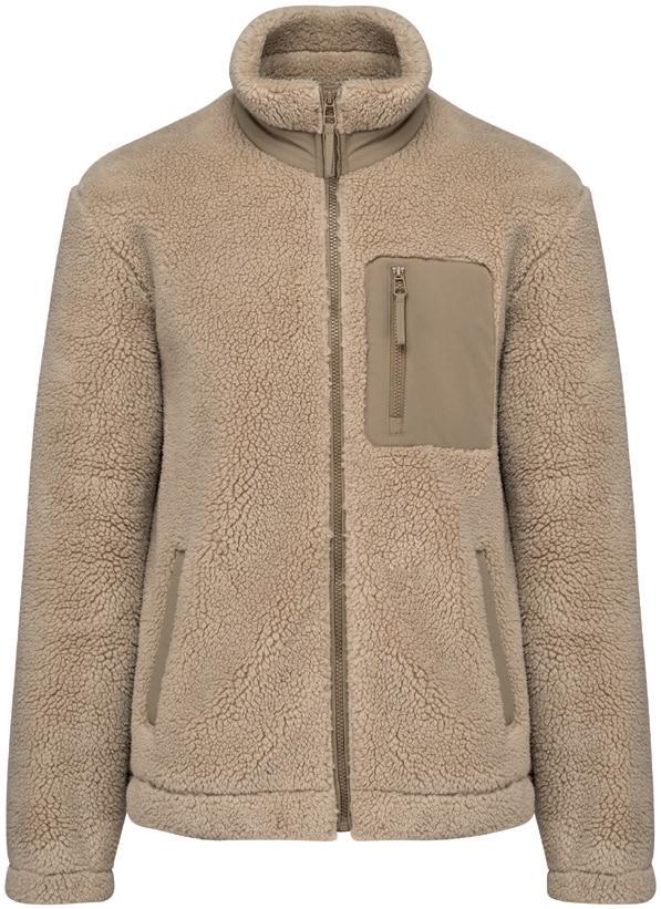 Outer layer made from at least 50% recycled polyester. Polyester fleece backed. Lightweight and quick drying. Showerproof and wind resistant. Front and back yokes.