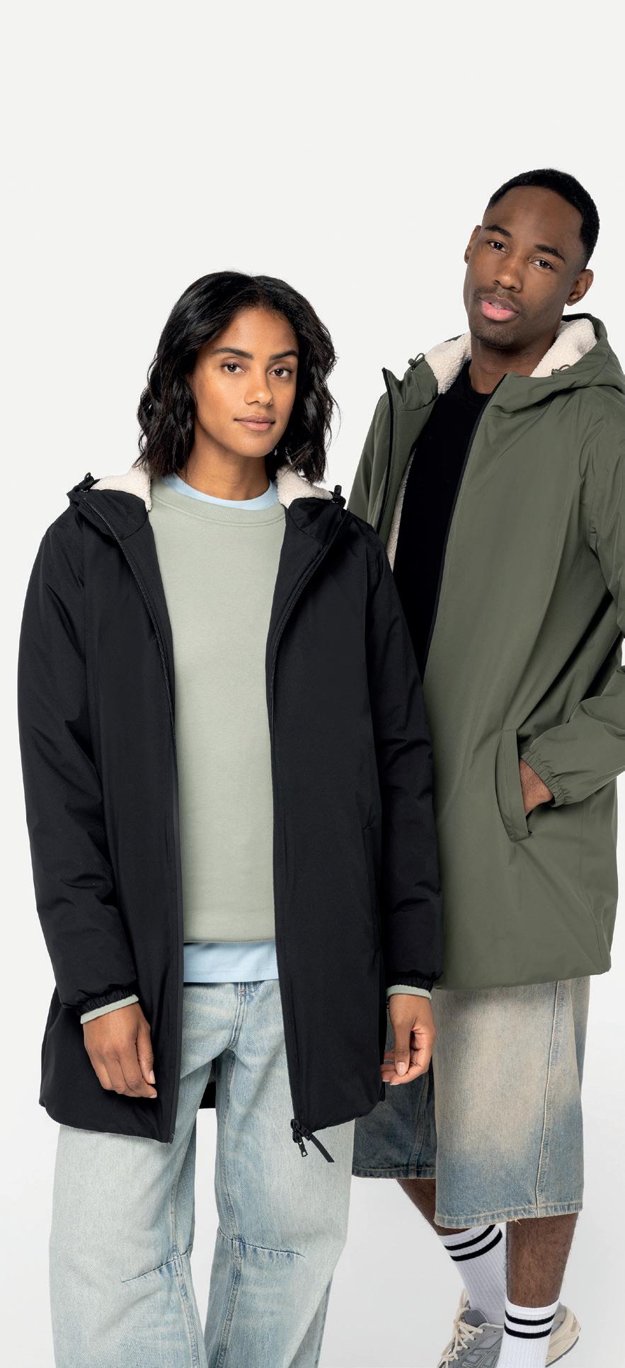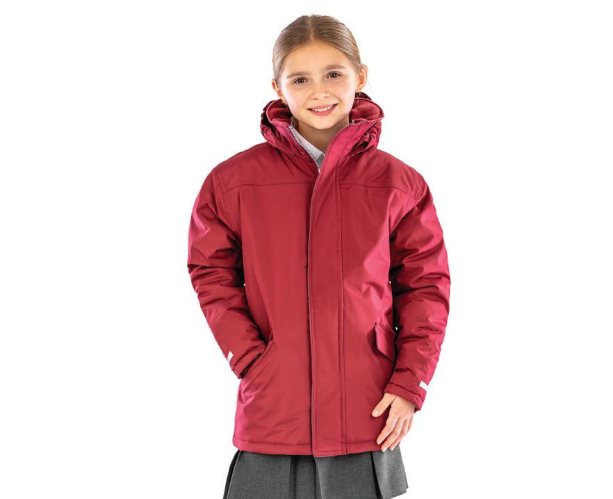 100% recycled polyester. Bonded fleece inner. Easy care fabric. Shower and wind resistant. Elasticated drawcord hem.