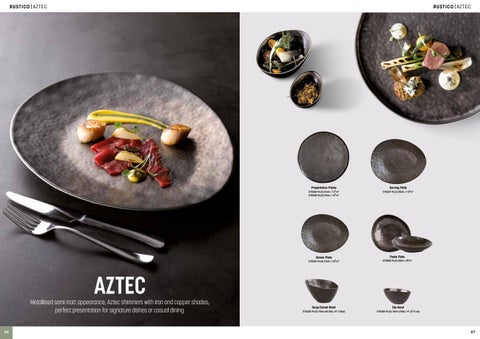 Metallised semi matt appearance, Aztec shimmers with iron and copper shades, perfect presentation for signature dishes or casual dining.