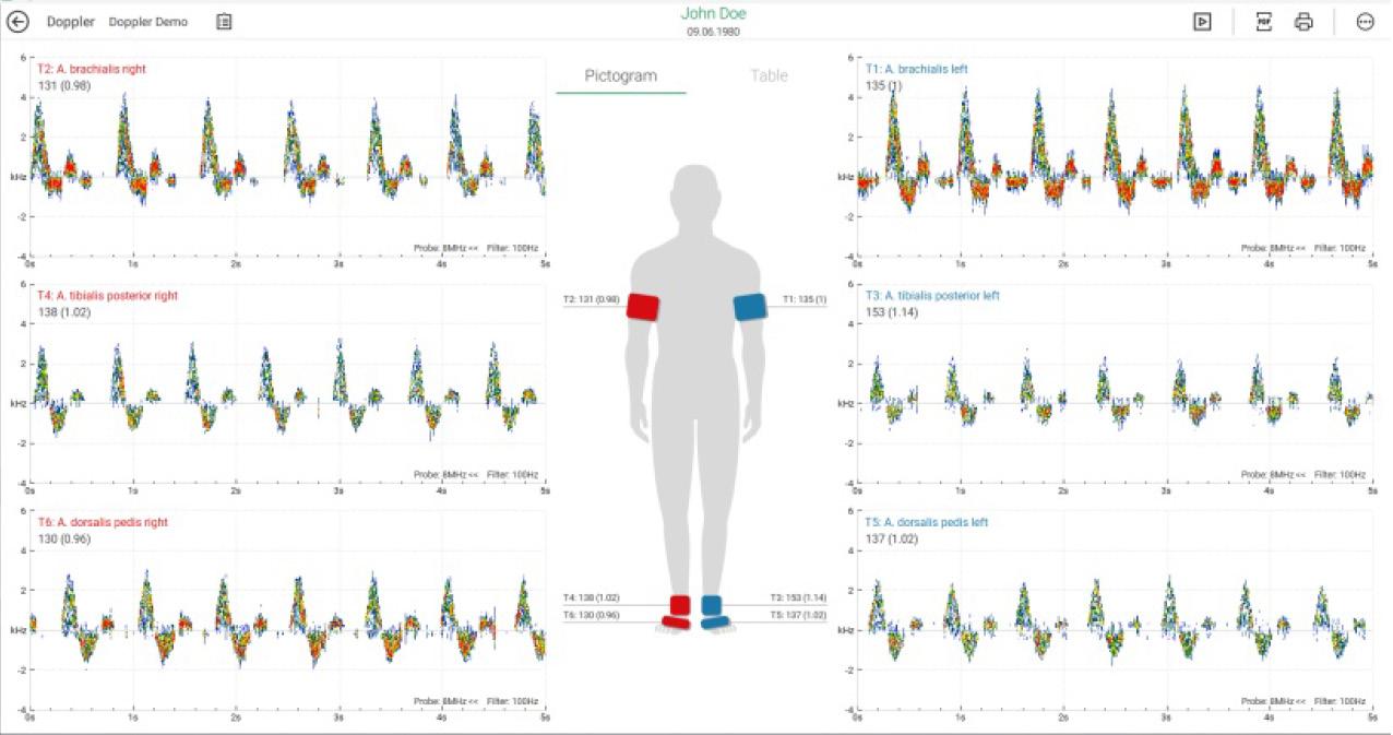 Az AngE kombinálja az ultrahangos szondákat a pneumatikus mandzsettákkal, hogy lehetővé tegye a Doppler-nyomásmérést akár 16 sávon. A Doppler-indexek egy pillanat alatt megjeleníthetők egy külön áttekintő jelentésben.