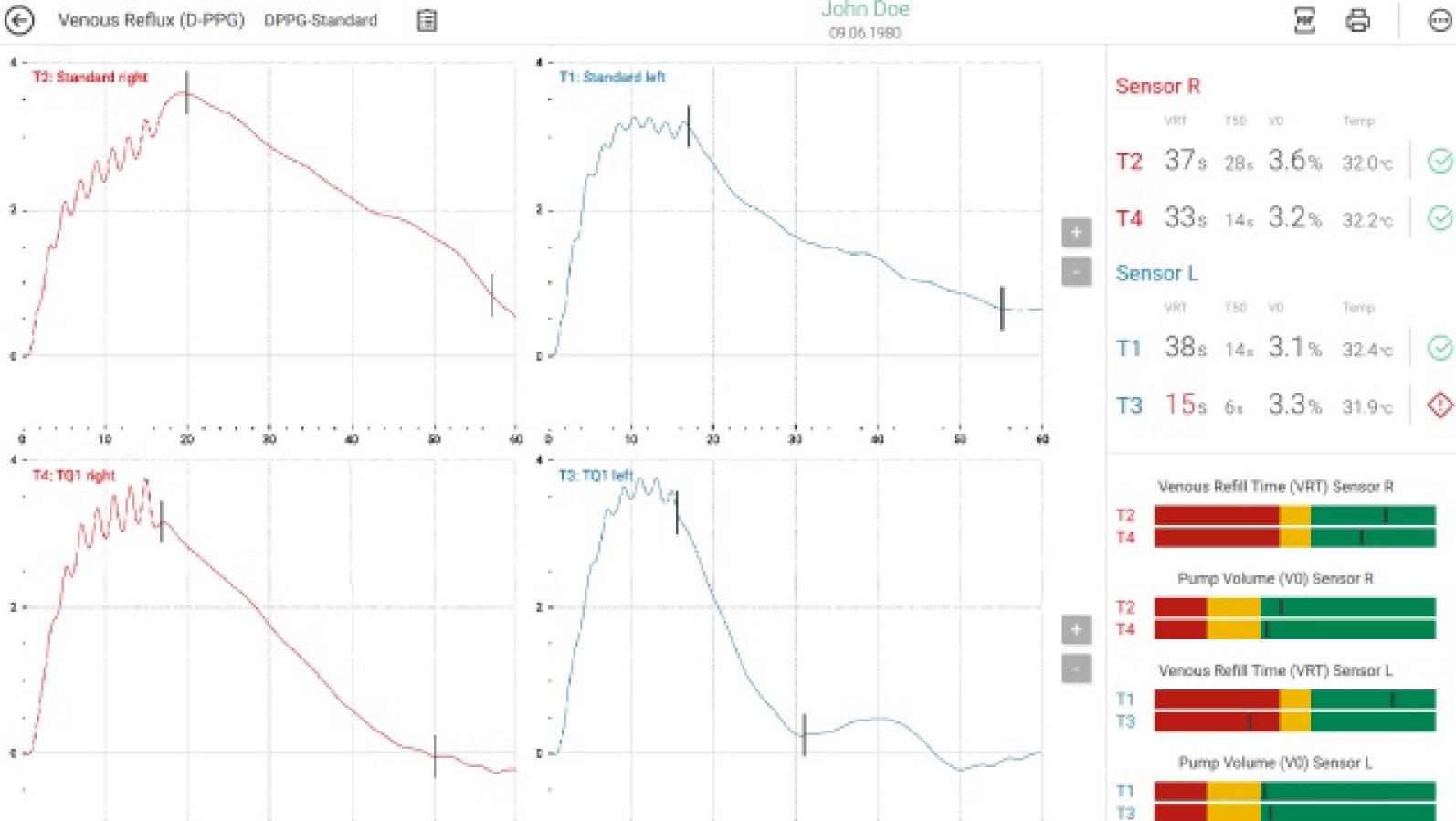 Az eredményeket kijelző lámpa lehetővé teszi a krónikus vénás elégtelenség – CVI (Chronic Venous Insufficiency ) gyors értékelését.