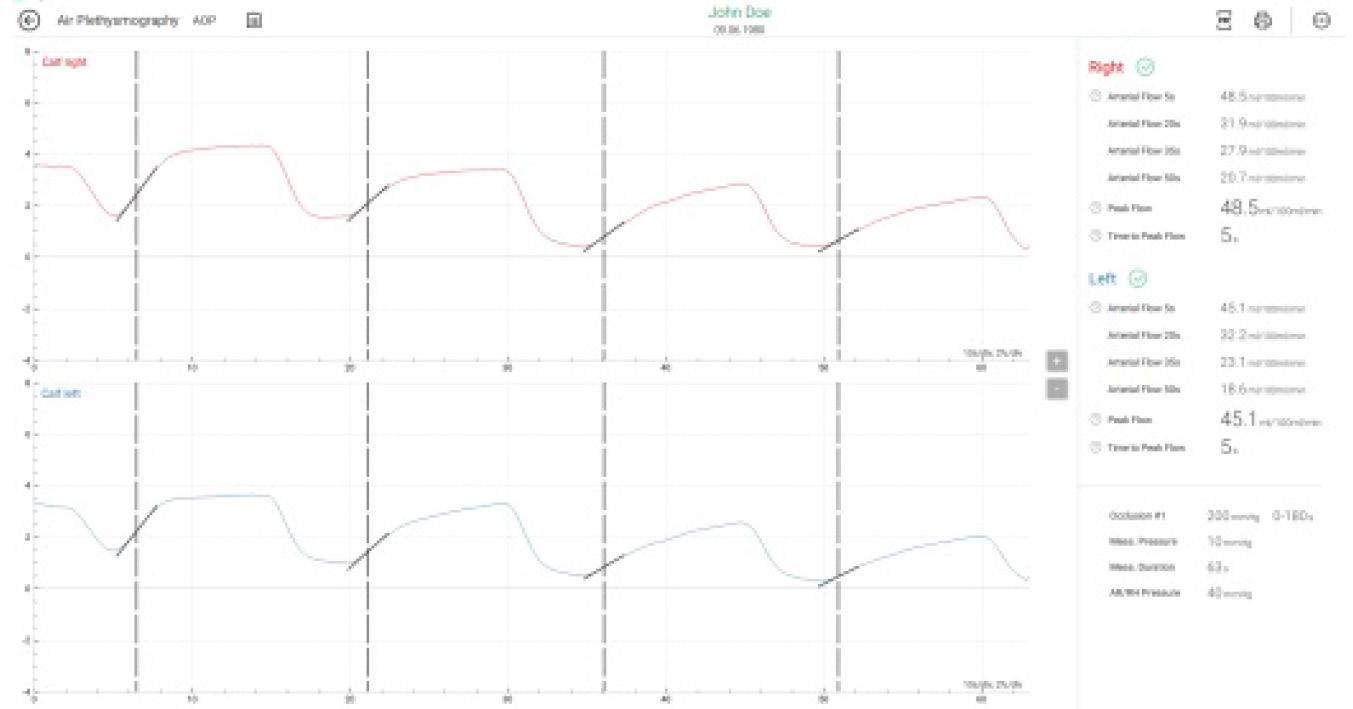 Ez lehetővé teszi az elzáródások lokalizálását, valamint a pulzushullám-paraméterek teljesen automatikus kiszámítását akár 45 másodperc alatt.