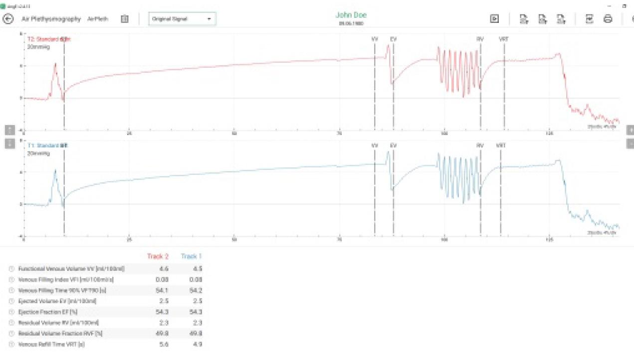 Kétszer 2 csatornás vénás funkcióteszt (Tourniquettel és anélkül) a szivattyú térfogatának meghatározásával (V0), kitöltési idő (T0), felezési idő (T50) és hőmérséklet.