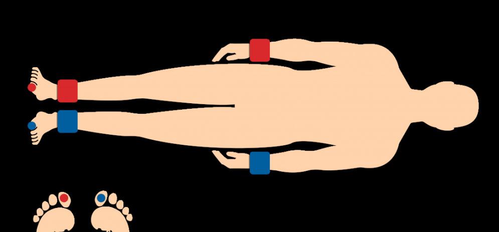 4 csatornás egyidejű pulzushullám-felvétel karokon és a bokákon