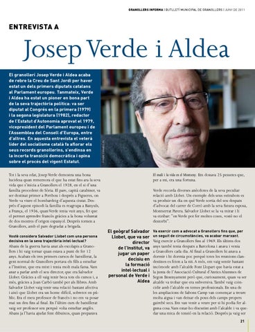 El granollerí Josep Verde i Aldea acaba de rebre la Creu de Sant Jordi per haver estat un dels primers diputats catalans al Parlament europeu. Tanmateix, Verde i Aldea ha estat un pioner en bona part de la seva trajectòria política: va ser diputat al Congrés en la primera (1979) i la segona legislatura (1982), redactor de l’Estatut d’Autonomia aprovat el 1979, vicepresident del Parlament europeu i de l’Assemblea del Consell d’Europa, entre d’altres. En aquesta entrevista el veterà líder del socialisme català fa aflorar els seus records granollerins, s’endinsa en la incerta transició democràtica i opina sobre el procés del vigent Estatut. Tot i la seva edat, Josep Verde demostra una bona lucidesa quan rememora el que ha estat fins ara la seva vida que s’inicia a Granollers el 1928, en el si d’una família procedent de Sòria. El pare, capità carabiner, va ser destinat primer a Portbou i després a Figueres, on Verde va viure el bombardeig d’aquesta ciutat. Després d’aquest episodi la família es reagrupa a Banyuls, a França, el 1936, quan Verde tenia vuit anys, fet que el permet aprendre francès gràcies a la bona voluntat de dos mestres d’origen espanyol. Després tornen a Granollers, amb el pare degradat a brigada. Vostè considera Salvador Llobet com una persona decisiva en la seva trajectòria intel·lectual?