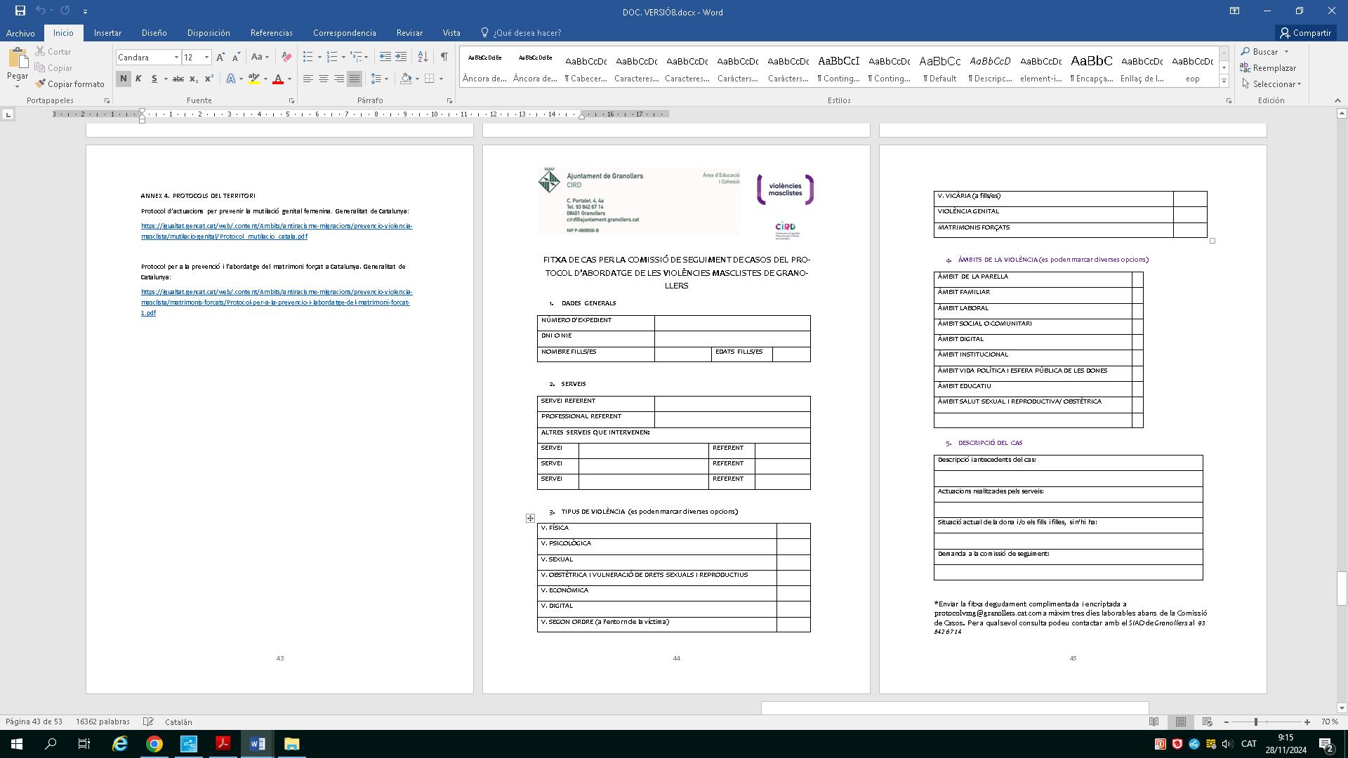 Des de l’Ajuntament de Granollers treballem en la lluita per a l’erradicació de les violències masclistes i en la lluita per a la igualtat entre dones i homes En aquest sentit, l’any 2004 es va aprovar el Protocol d’atenció a dones víctimes de violència de gènere, i es va revisar i actualitzar l’any 2016. Aquest Protocold’abordatge delesviolènciesmasclistes que presentem és fruit de la revisió i la incorporació dels canvis legislatius dels últims anys. És un protocol consensuat entre els diferents agents del territori que estan implicats en la intervenció de les violències masclistes, ja sigui en la sensibilització, la prevenció, la detecció, l’atenció, la recuperació o la reparació.
