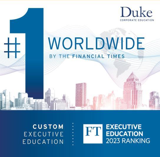 Duke Corporate Education (Duke CE) is the premier global provider of leadership development and are a blend of a business and university. From the business world, they bring an outcomes-driven focus and real-world insight. From their university heritage, they bring academic rigor and research. Duke CE is consistently rated among the best in the world.