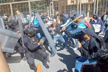 Policías antimotines desalo jaron a estudiantes normalistas que tenían bloqueados los dos accesos del Palacio de Gobier no en Chilpancingo, Guerrero, donde se manifestaban.
