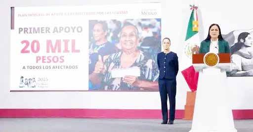 Ciudad de México, 20 de octubre de 2025.- La Presidenta Claudia Sheinbaum Pardo anunció que el Gobierno de México realizará una inversión inicial de 10 mil millones de pesos (mdp) para otorgar apoyos directos a las 100 mil familias damnificadas que se estima dejaron las lluvias extraordinarias en Veracruz, Hidalgo, Puebla, Querétaro y San Luis Potosí, esto sin contar lo que invertirá la aseguradora Agroasemex S.A., la aseguradora del Estado mexicano, que ya asignó empresas para la atención de escuelas, clínicas y atención de caminos. Resaltó que, como parte del Plan Integral de apoyo a los afectados por las lluvias, se entregará el primer apoyo de 20 mil pesos a todos los damnificados en los estados de Querétaro, San Luis Potosí, Puebla y Veracruz, del 22 al 29 de octubre, mientras que en Hidalgo será del 25 de octubre al 5 de noviembre.