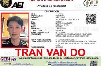 el hombre fue visto por última vez el viernes 24 de octubre en el Hotel Wyndham Garden, ubicado sobre la avenida Universidad, en la Colonia del Roble, en San Nicolás. Tres días después, el lunes 27, la Fiscalía activó una alerta de búsqueda a través del Grupo especial de búsqueda Inmediata (GebI). Javier Flores detalló que las autoridades se encuentran localizando al conductor de una plataforma que presuntamente trasladó al vietnamita el día de su desaparición. "Se está buscando al taxista para que establezca a dónde lo llevó. Al parecer lo trasladó hacia la frontera y por eso se le está citando", señaló. La Fiscalía mantiene comunicación con el consulado de Vietnam y con autoridades de Tamaulipas, para continuar con la localización de Tran Van do.