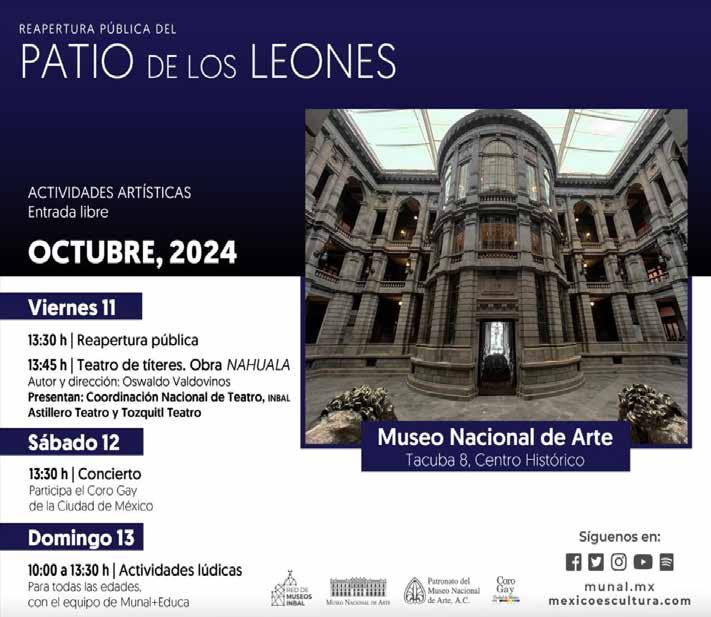 La Secretaría de Cultura del Gobierno de México y el Instituto Nacional de Bellas Artes y Literatura (Inbal), a través del Museo Nacional de Arte (Munal), informan que tras la realización de trabajos especializados de mantenimiento y conservación, el Patio de los Leones será abierto públicamente a partir de este viernes 11 de octubre de 2024.
