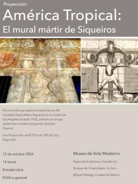 La Secretaría de Cultura del Gobierno de México y el Instituto Nacional de Bellas Artes y Literatura (Inbal), a través del Museo de Arte Moderno (MAM), estrenan en México el documental América Tropical: The Martyr Mural of Siqueiros (América Tropical: El mural mártir de Siqueiros), como parte de las actividades por el 60 aniversario del recinto anfitrión.