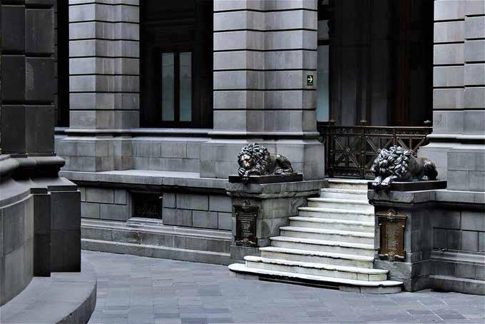 Su escalera de acceso está flanqueada por dos leones de bronce que aluden al trabajo del Palacio de Comunicaciones y Obras Públicas; mientras uno se encuentra echado, el otro vigila la permanente actividad del edificio, cuya labor regulaba los ferrocarriles, telégrafos,