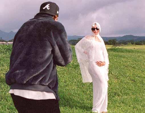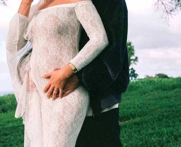posa con un vestido blanco de encaje de Yves Saint Laurent. En varias instantáneas, la mayoría en blanco y negro, aparecen ambos con sus manos en el vientre de Hailey. La modelo, de 27 años, usa lentes oscuros en algunas tomas, mientras que Justin una playera blanca, jeans negros y una gorra. Sin acompañar la publicación con algún mensaje, los Bieber deja-