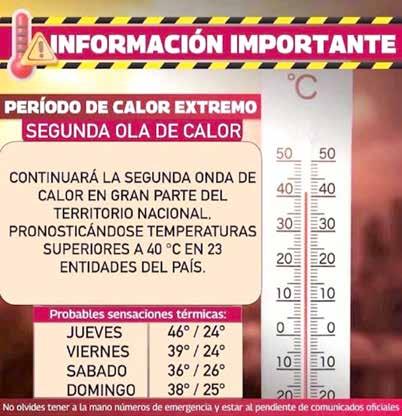 En tanto, Sonora, Nayarit, Jalisco, Colima, Morelos, Puebla, Hidalgo, Nuevo León y Quintana Roo presentarán temperaturas máximas de entre 40 y 45 grados. "A partir del sábado finalizará la onda de calor, debido al debilitamiento de la circulación anticiclónica en niveles medios de la atmósfera que la originó", apuntó el SMN en su Pronóstico Extendido a 96 horas.