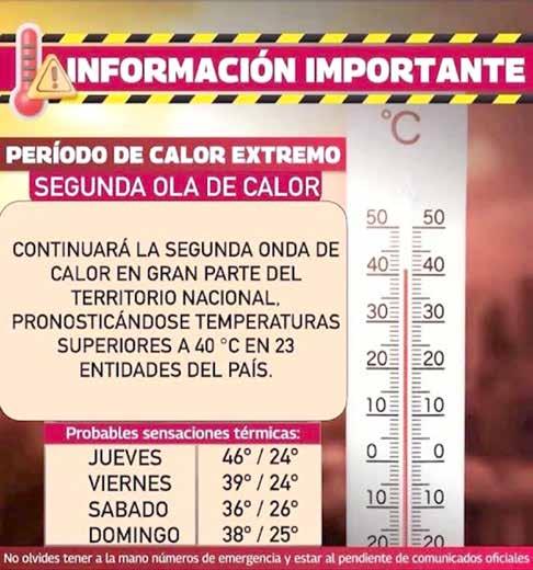 Este viernes, indicó, se registrarán temperaturas máximas superiores a 45 grados Celsius en Sinaloa, Michoacán, Guerrero, Oaxaca, Chiapas, Tamaulipas, San Luis Potosí, Veracruz, Tabasco, Campeche y Yucatán.