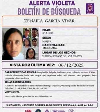 Zenaida García Vivar y sus cinco hijos desaparecieron el pasado 6 de diciembre y hasta este domingo continúa su búsqueda, confirmó una fuente de la Secretaría de Seguridad Pública. En una ficha de Alerta Violeta, el Gobierno de Guerrero informa que García, de 33 años y originaria del municipio de Metlató-