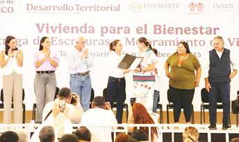 La secretaria de Desarrollo Agrario, Territorial y Urbano, Edna Elena Vega Rangel, destacó que la autora y diseñadora del Programa de Vivienda para el Bienestar fue la propia Presidenta y que en Nayarit tiene una meta de 23 mil créditos: 16 mil de Infonavit y 7 mil de Conavi con la generación de 5 mil empleos directos y 8 mil indirectos; además de la entrega de 9 mil escrituras, todo en bene-