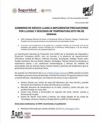La Coordinación Nacional de Protección Civil (CNPC) de la Secretaría de Seguridad y Protección Ciudadana (SSPC) informa que, de acuerdo con el Servicio Meteorológico Nacional (SMN), el frente frío número 13 ingresará durante la noche de este sábado 8 de noviembre y primeras horas del domingo 9 de noviembre sobre el norte y noreste de México, impulsado por una masa de aire ártica, que ocasionará lluvias intensas, vientos fuertes y un marcado descenso de temperatura en diversas regiones del país.