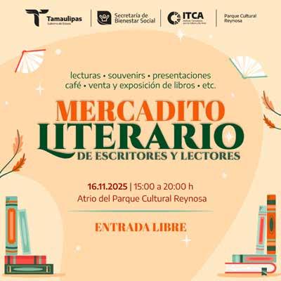 Con el propósito de fortalecer los lazos entre autores, librerías y lectores de la región, el Gobierno del Estado de Tamaulipas, a través de la Secretaría de Bienestar Social y el Instituto Tamaulipeco para la Cultura y las Artes (ITCA), en colaboración con el Centro de Arte y Cultura del Parque Cultural Reynosa, invitan al público a disfrutar del Mercadito Literario: De escritores y lectores. El evento se realizará el domingo 16 de noviembre, en un horario de 15:00 a 20:00 horas,