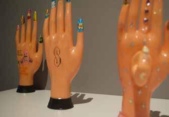 El nail art se vuelve objeto de reflexión en Luxury efímero (piedras, brillos, deudas, pendientes, entre el esmalte y la renta, mis uñas valen más que mi sueldo) (2023), de Yolanda Arvizu (San Luis Potosí, 2000). La artista intervino cinco manos de silicón con nail art para cuestionar roles de género, moda, pre-
