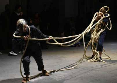 Participaron Valentina Díaz, Galia Eibenschutz, Nina Fiocco, Lucía Hinojosa Gaxiola y Kara Rooney, quienes llevaron a cabo una serie de acciones colaborativas con la intención de tender puentes entre espíritu y materia, para reflexionar sobre las posibilidades que tenemos como sociedad de incorporar herramientas artísticas para afrontar el peso de los traumas colectivos. Kara Rooney —artista que considera el lenguaje como la principal fuerza motriz de su quehacer— y Galia Eibenschutz —quien trabaja con las artes plásticas y el arte escénico— improvisaron con cuerdas y movimiento. Su acción, titulada precisamente El acto del peso, es un experimento en el que las fuerzas opuestas de empujar y tirar, tensión y liberación, se representan entre dos cuerpos.