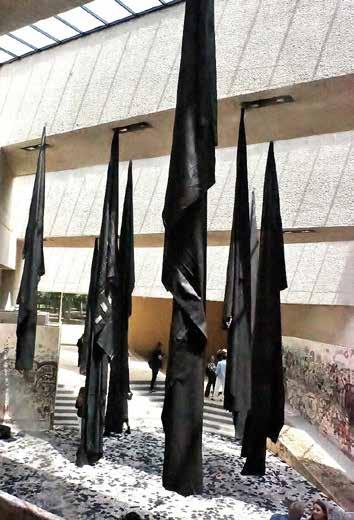 y colectividad. Destacan grandes franjas de tela negra que formaron parte de All the World’s Futures (Todos los futuros del mundo), instalación presentada en la 56ª Bienal de Venecia, las cuales ocupan el espacio como una presencia espiritual latente. La muestra integra además un fotomural que presenta a la madre del artista para abordar la relación entre cuerpo y trabajo, migración e industria, entre otros temas, así como una serie de videos documentales y poéticos realizados por Murillo en Colombia y el Reino Unido.