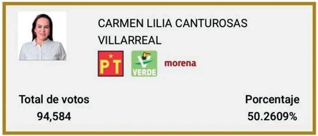 la elección con una ventaja de 4 mil 677 votos sobre Yahleel Abdala. La abanderada de "Sigamos Haciendo Historia" obtuvo el 50.2609 por ciento, equivalente a 94 mil 584 votos, para así lograr el triunfo en la contienda por la Presidencia Municipal de Nuevo Laredo.