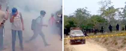 cial. Para recabar evidencias, las autoridades cerraron un camino de terracería y no permitieron el acceso. Para exigir el paso, llevaron palos y algunos se cubrieron el rostro, por lo que para reforzar fueron enviados integrantes de la Secretaría de la Defensa Nacional, quienes tomaron el control de la zona. "¡Es propiedad privada!", "¡Déjennos pasar!", "Ahorita van a